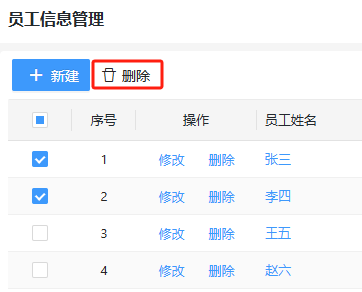多删,即批量删除,列表页面全局系统操作,可以对列表数据批量选中删除。