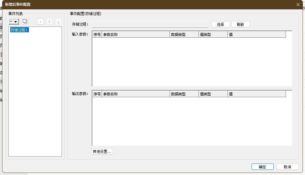 参数获取:选择存储过程后,下方会自动获取到该存储过程定义的输入参数和输出参数。若在数据库中修改过相应的参数,单击【刷新】按钮可以获取最新的参数。