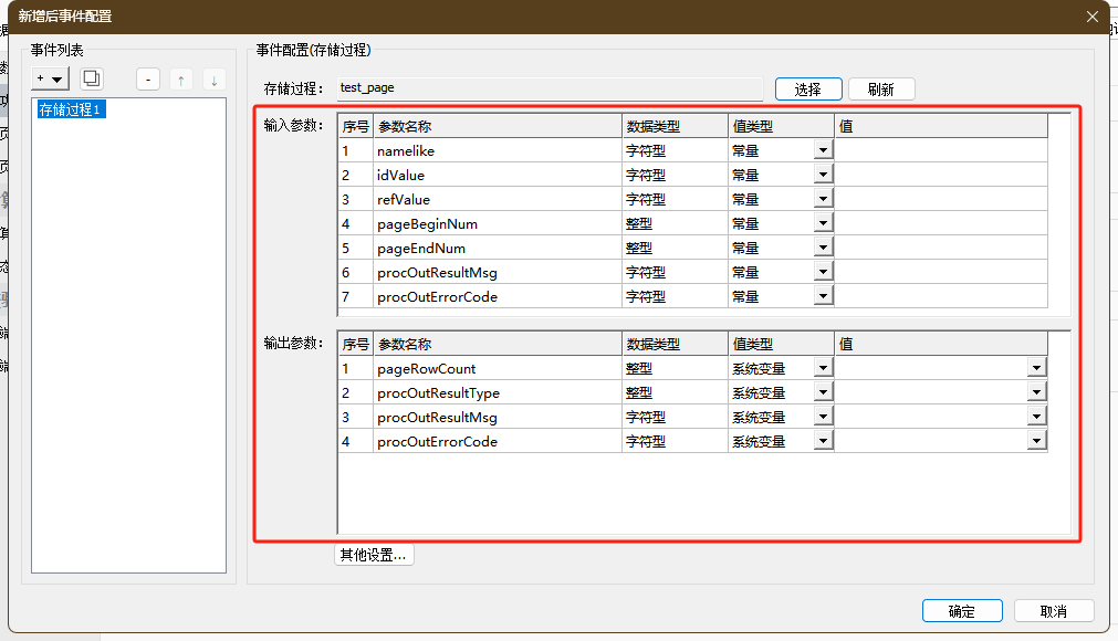 如下图所示,需要配置的有存储过程、输入参数以及输出参数。