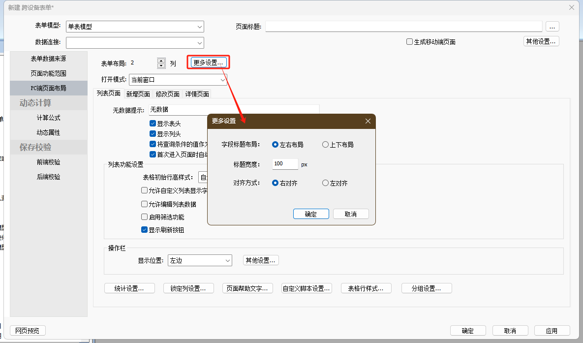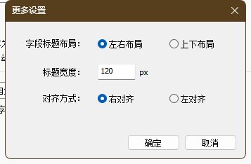 在【更多设置】中可以对字段标题布局进行配置。目前字段标题与字段控件或数据之间支持两种布局方式:“左右布局”或“上下布局”。