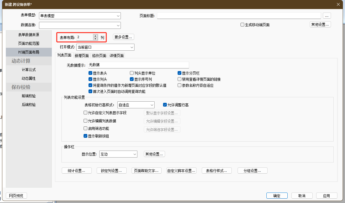 配置PC端表单新增页面、修改页面、详情页面字段布局。