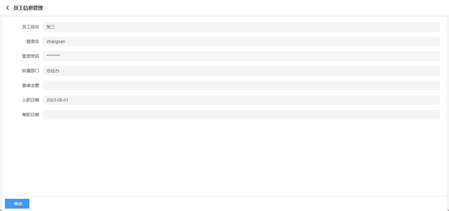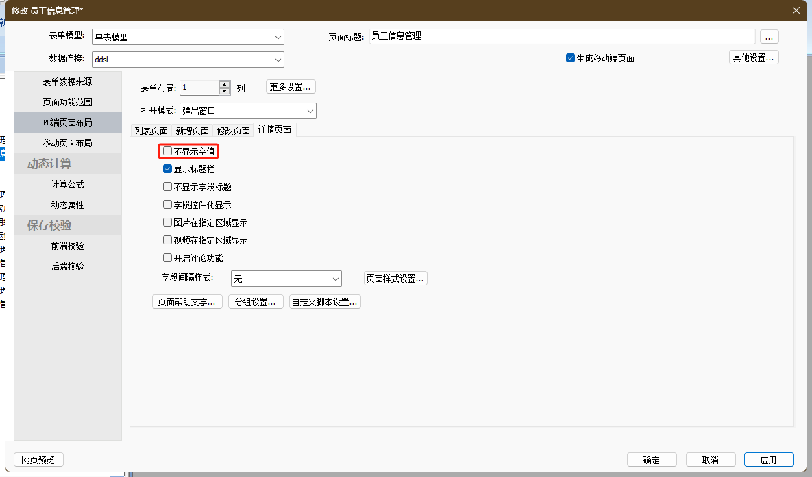 例如下图员工信息详情页面,“直接主管”和“离职日期”字段值为空,若展示时希望不要显示就可以通过勾选“不显示空值”来隐藏。
