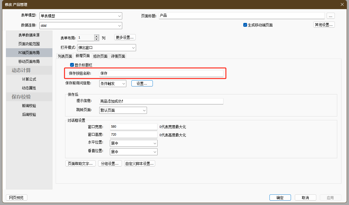 注意:保存后跳转页面选择“默认页面”时,页面跳转的具体表现取决于填报页面的【打开模式】配置。当打开方式为“当前窗口”时默认跳转列表页面;当打开方式为“弹出窗口”时则默认交互为关闭当前填报页面的弹窗。