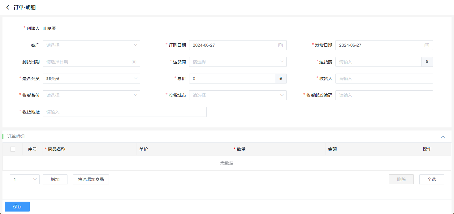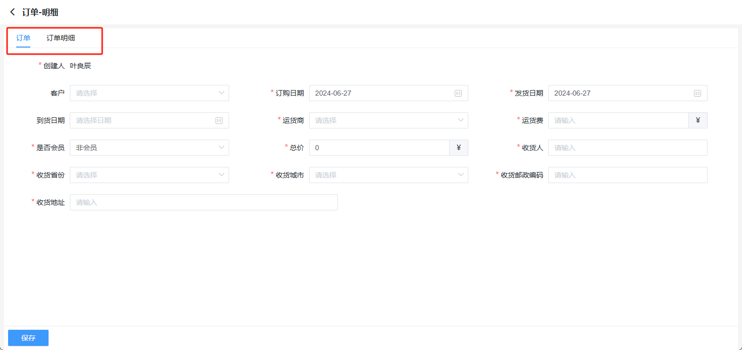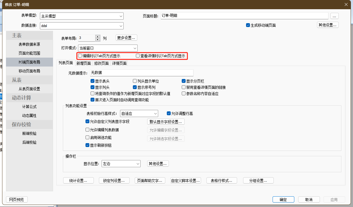 未勾选时,以编辑页面为例如下图所示,页面布局为主表在上,从表跟随在主表下方显示。