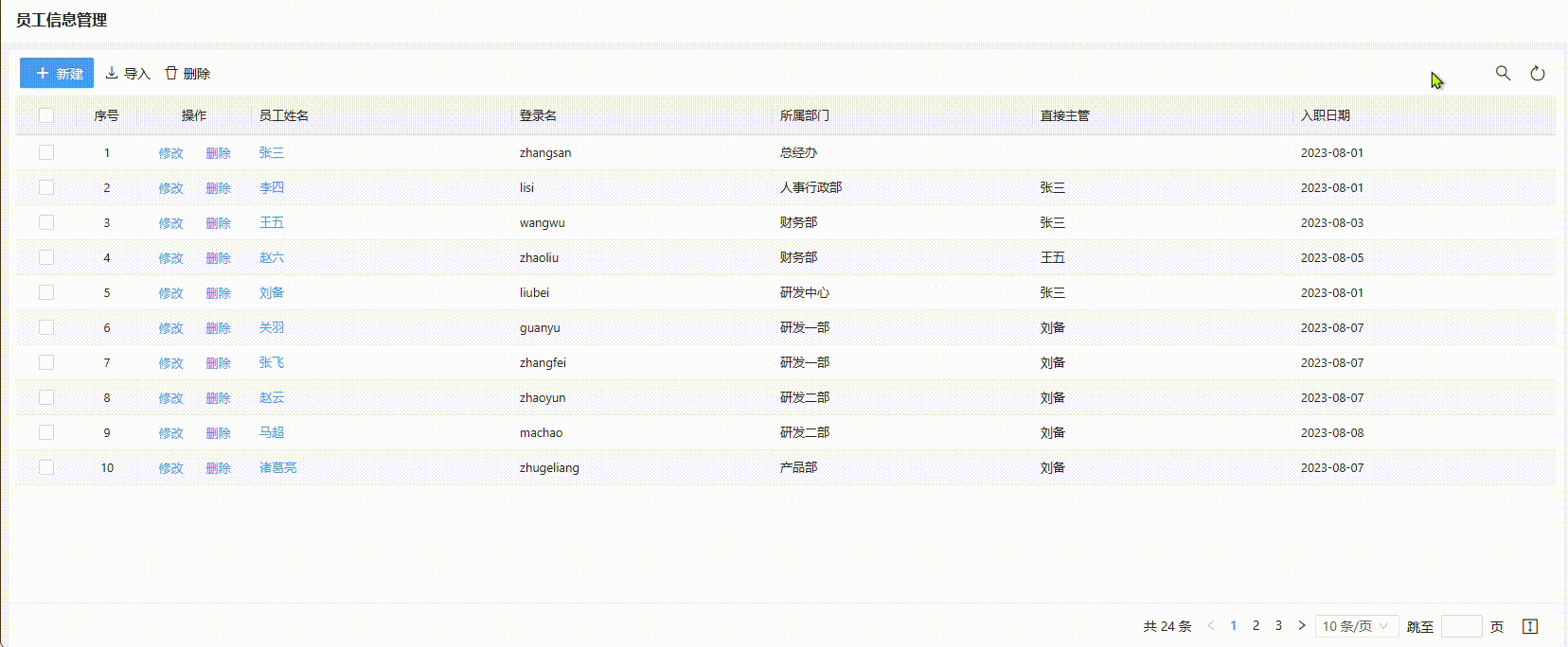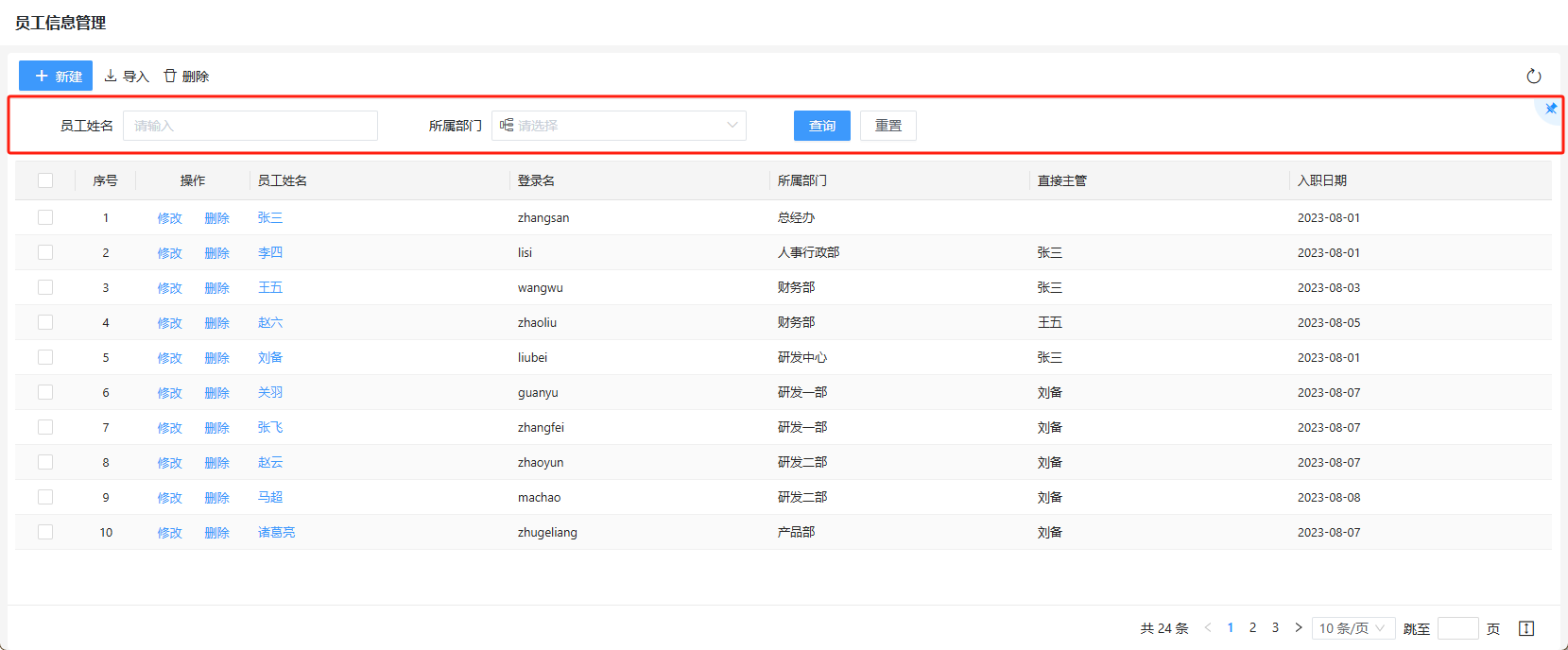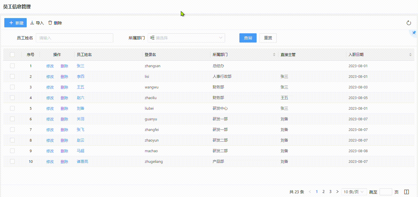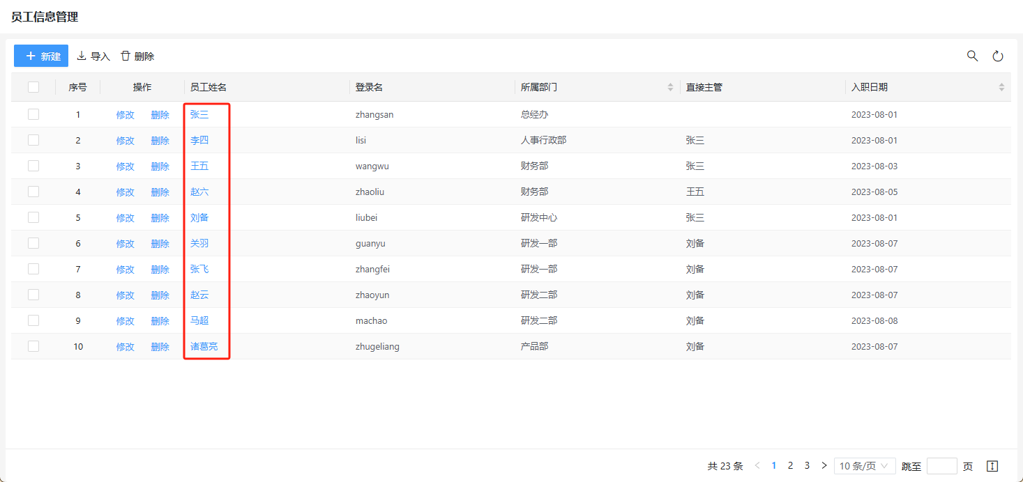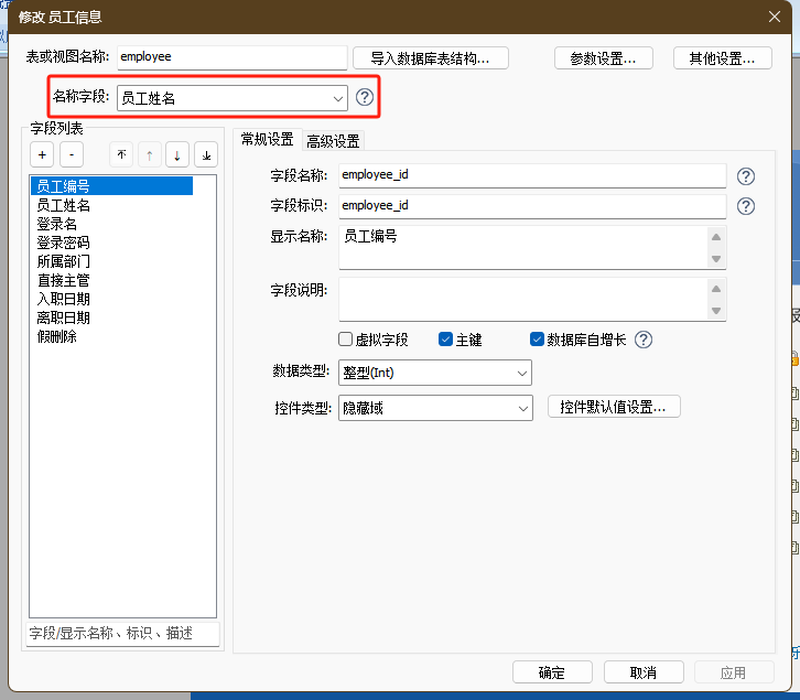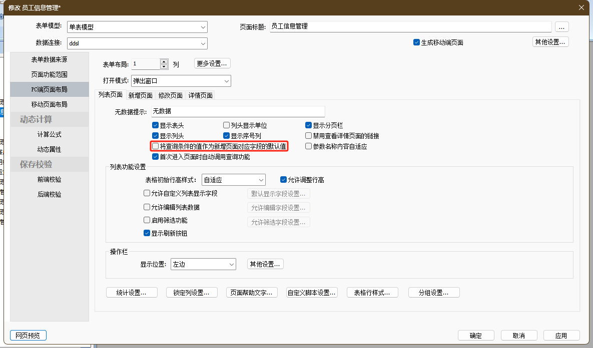 勾选后,当列表页面表格数据经过参数查询过滤后,此时去点击【新增】去新增数据时,会将当前的参数查询条件作为新增页面对应字段控件的默认值,如下图中在列表页面查询过“产品部”的员工,此时若需要添加新员工,会为新员工的“所属部门”字段填充默认值“产品部”。