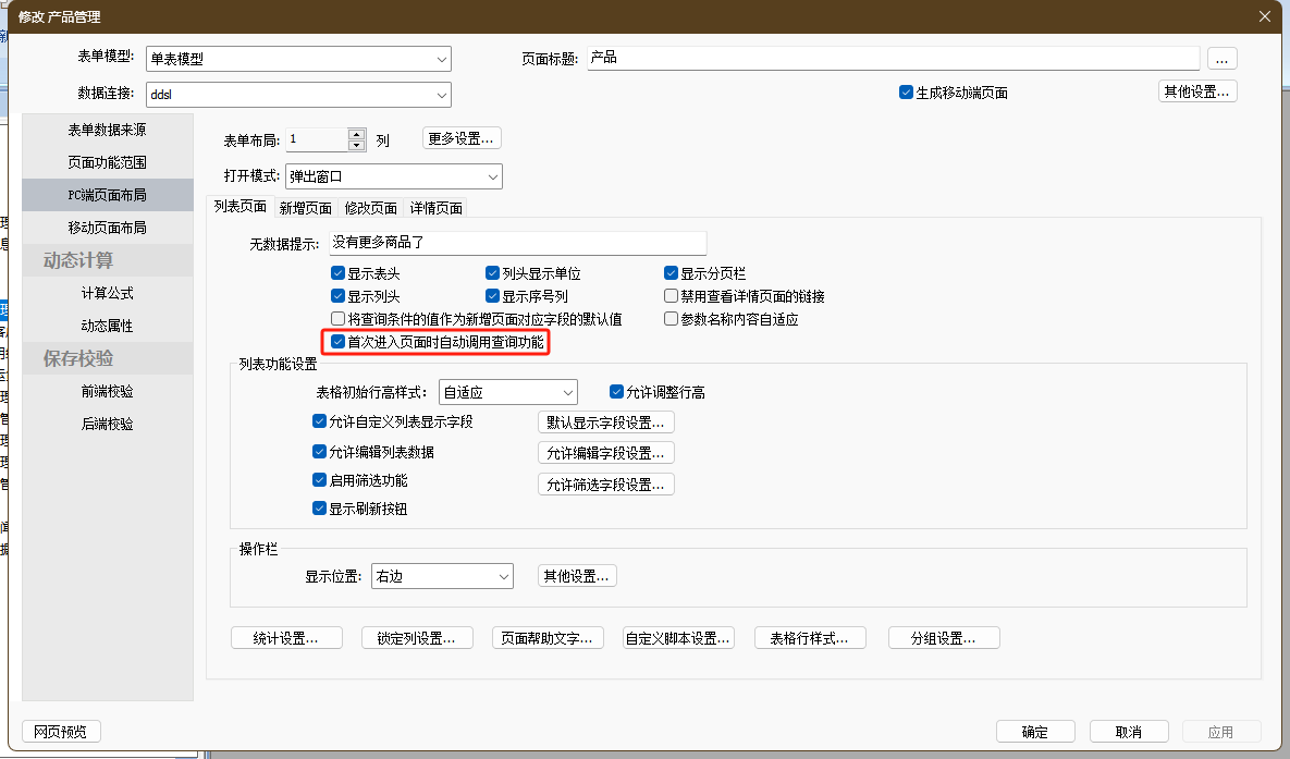 控制列表页面加载时是否自动调用参数查询获取列表数据。未勾选时,则列表加载时不自动执行查询,需要手动查询才能获取列表数据。