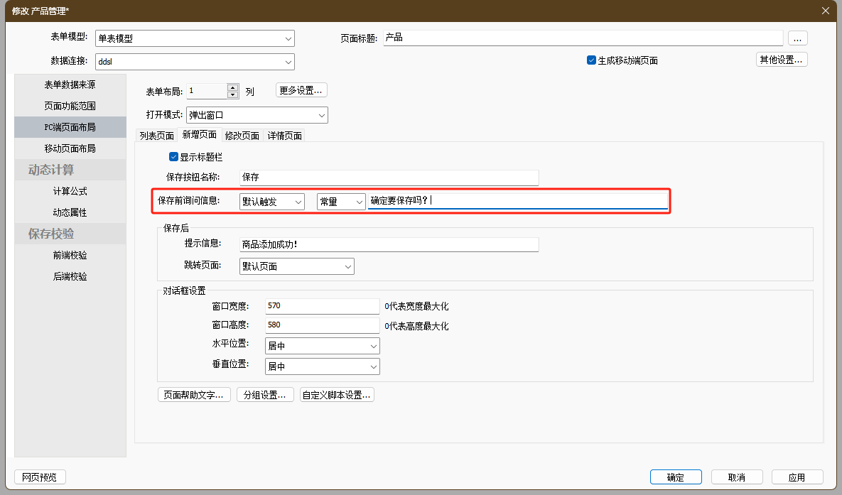 当保存前一律需要进行二次确认时,可以配置询问内容,内容支持常量或表达式编辑,例如需要在页面保存前询问“确定要保存吗?”,可以如下图配置。