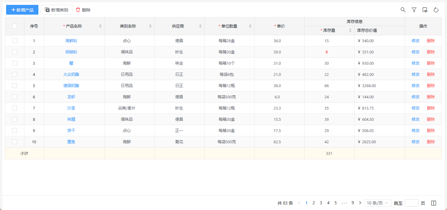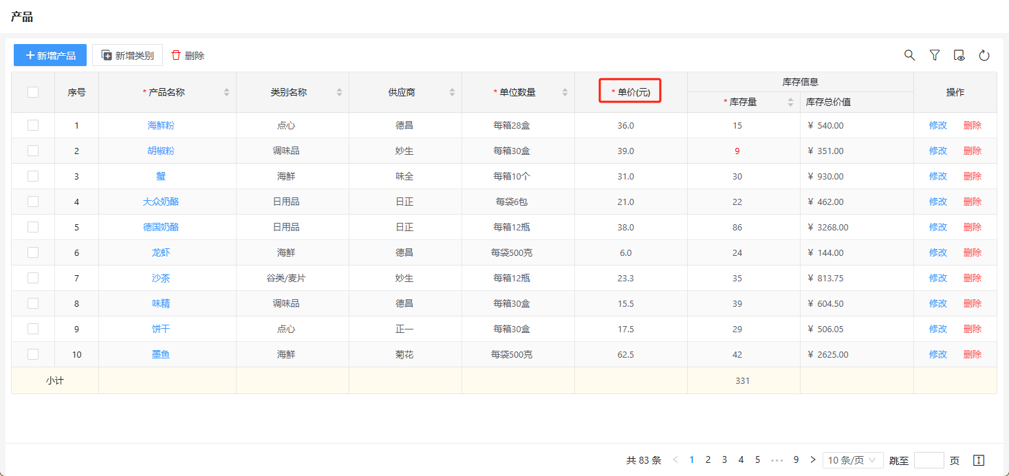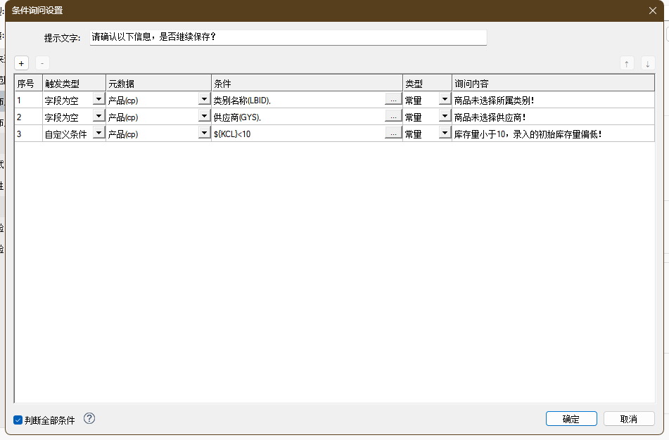 例如商品信息维护时虽然“类别名称”和“供应商”字段为选填字段,但在商品保存时还是希望提醒用户尽量去填写,可以通过【字段为空】设置询问信息。又例如在新增或修改商品信息时,当库存量填写值小于10件时希望引起用户注意,提醒当前填写的库存量偏低,配置方式可以如下图所示。