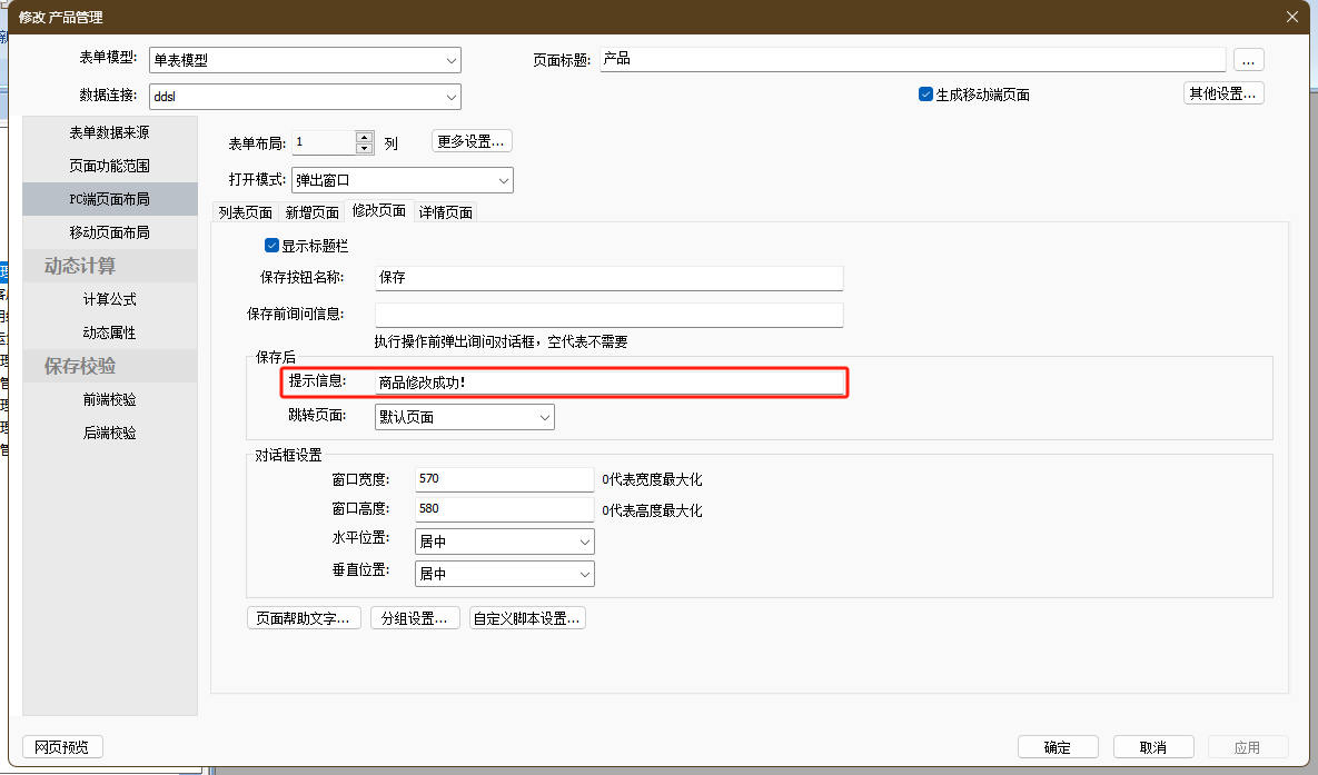 例如修改页面需要将提示信息调整为“商品修改成功!”,如下图所示。