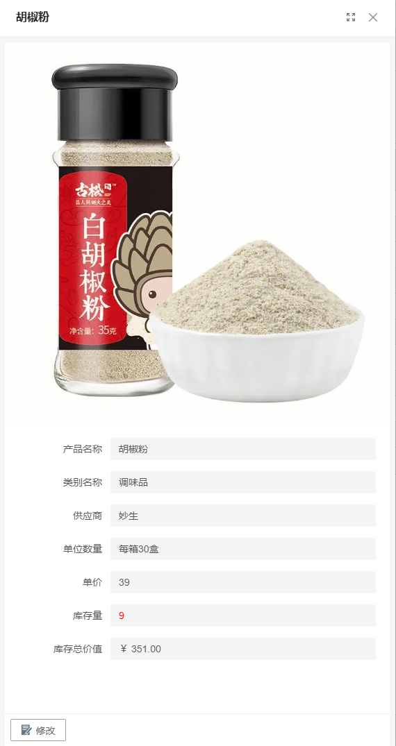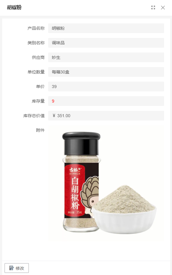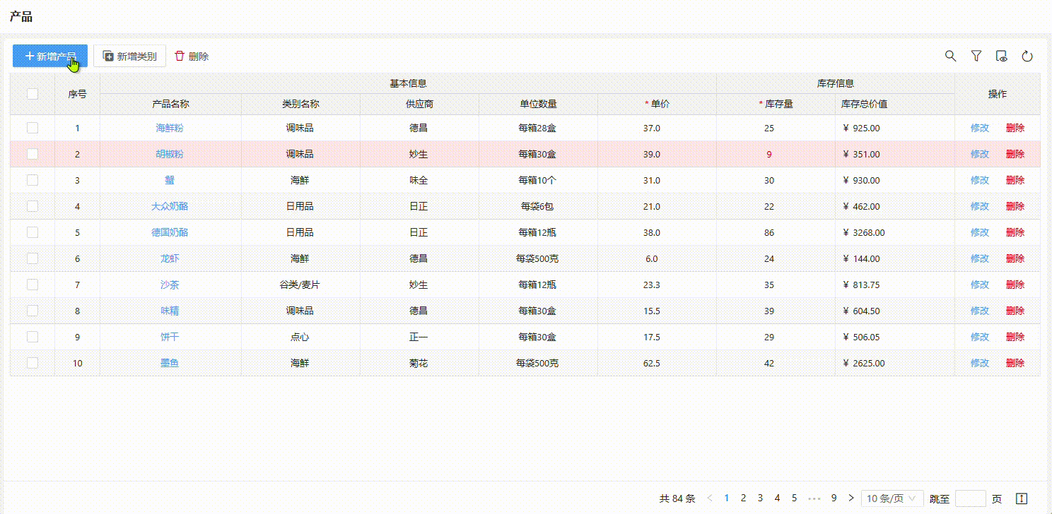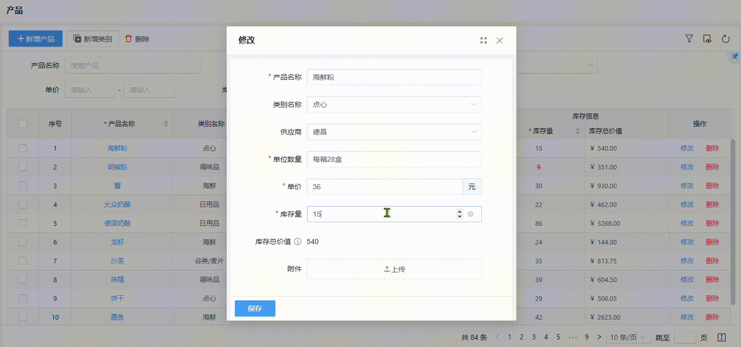 - 上图中第一次保存时,由于“供应商”字段未填写且“库存量”8小于10,分别触发了字段为空和自定义条件的提醒内容,用户想要回去完善填报内容可以点击取消保存后返回修改(部分字段为空的控件会标红显示提醒用户去填写);
