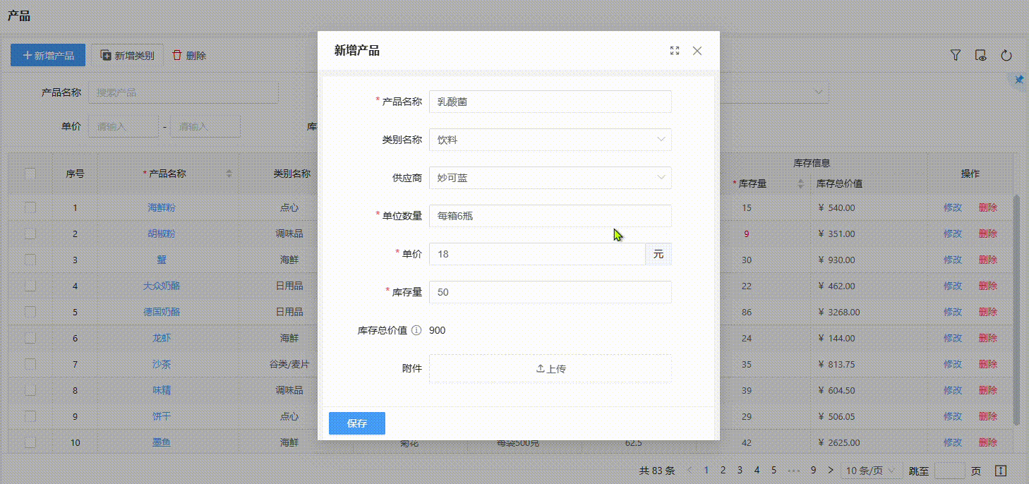 - 当用户填写好供应商后进行第二次保存时,就只有库存量会触发提醒内容,此时用户查看后选择忽略该提醒继续保存,依旧可以成功保存商品信息。