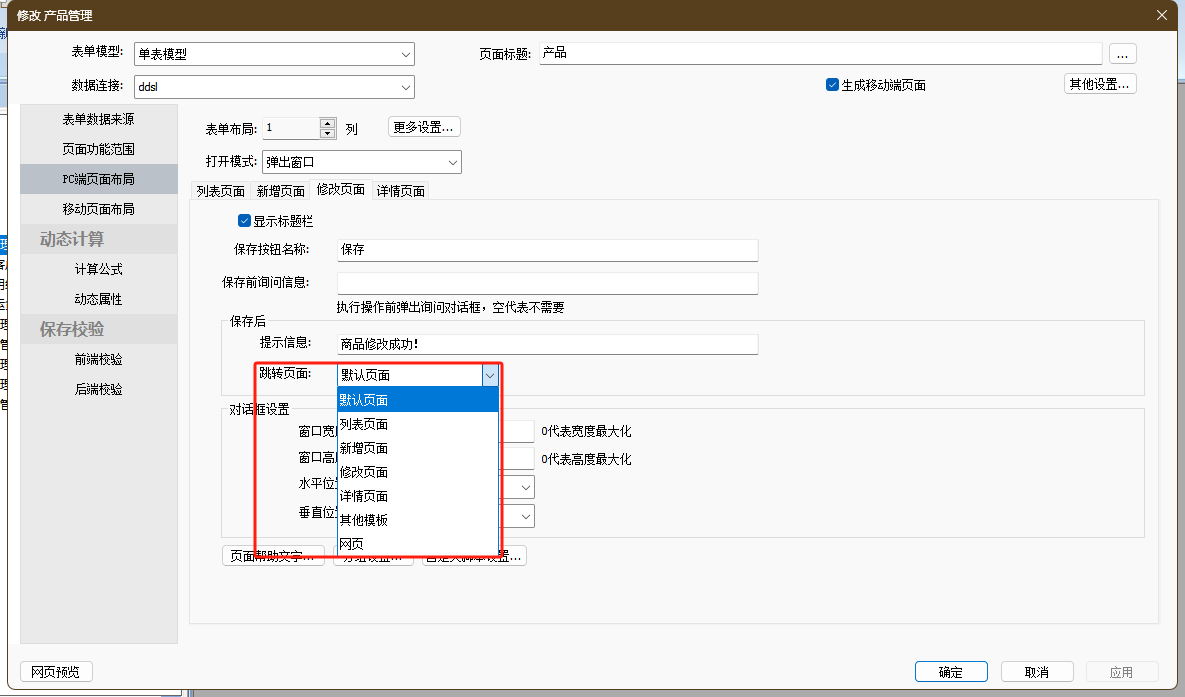 用于配置填报页面保存成功后需要跳转的页面。支持跳转的选项有“默认页面”、“列表页面”、“新增页面”、“修改页面”、“详情页面”、“其他模版”、“自定义网页”。如下图所示。