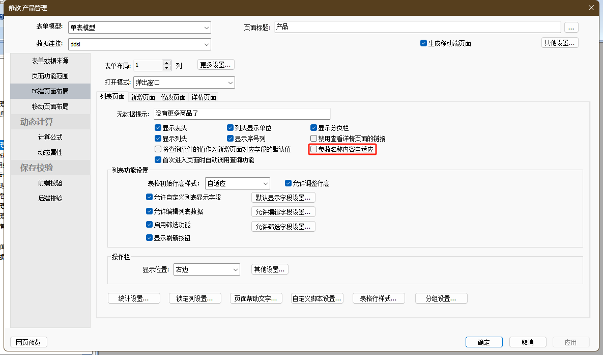 - 【参数名称内容自适应】默认不勾选。未勾选时,PC端当前表单所有参数字段显示名称宽度固定100px,参数名称超出省略显示