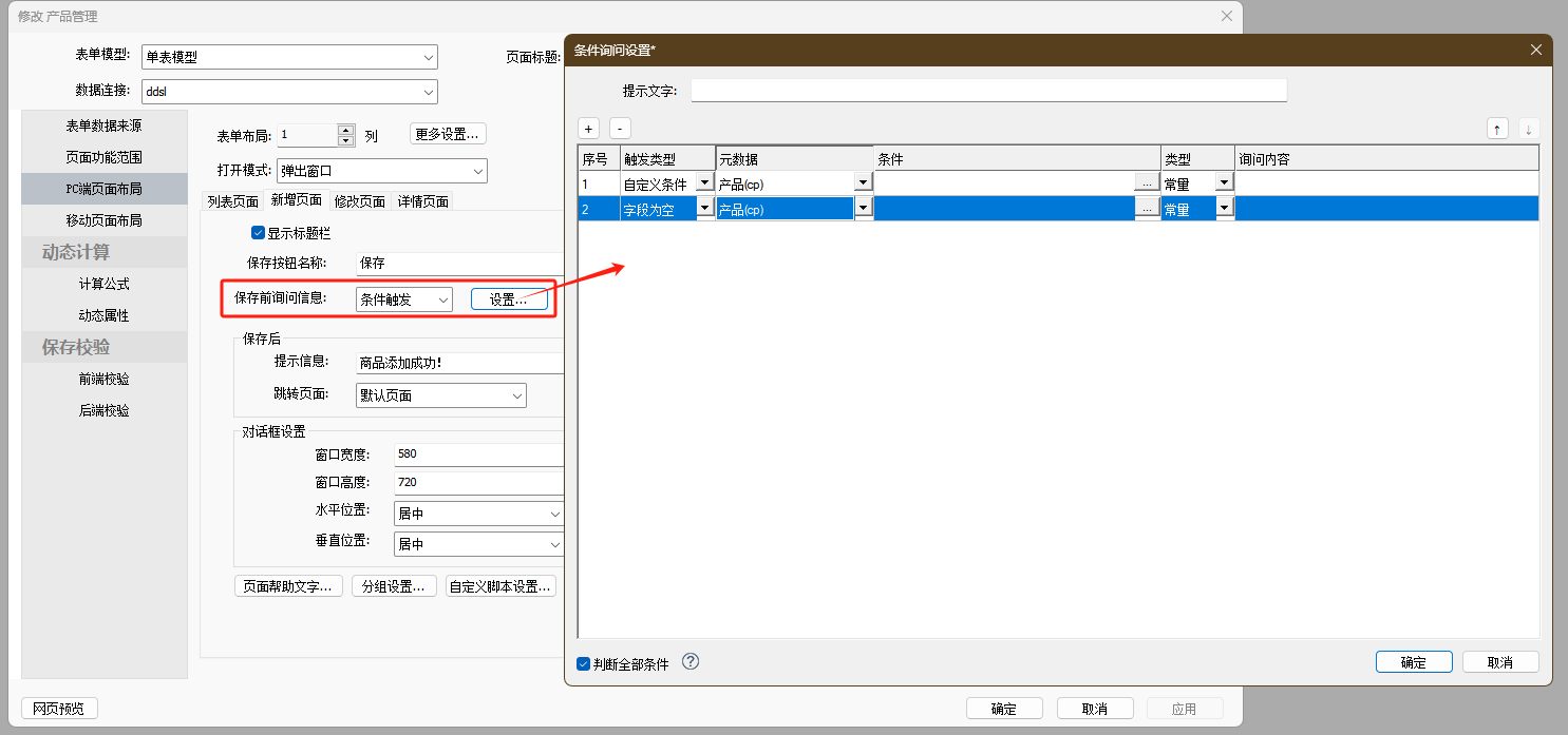 “条件触发”适用于一些特定条件下才需要触发保存前询问的应用场景,例如某些字段未填写或填写内容触发了某些条件。