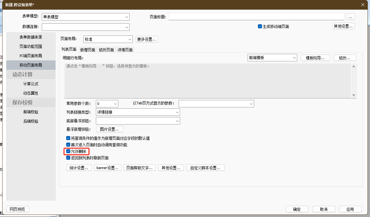 有时业务对数据的删除较为谨慎,不希望可以在移动端轻易删除数据,就可以通过此配置项来控制不允许在移动端删除,配置不允许删除后,界面上表现为列表页面不再显示“删除”或“批量删除”这两类系统操作按钮。