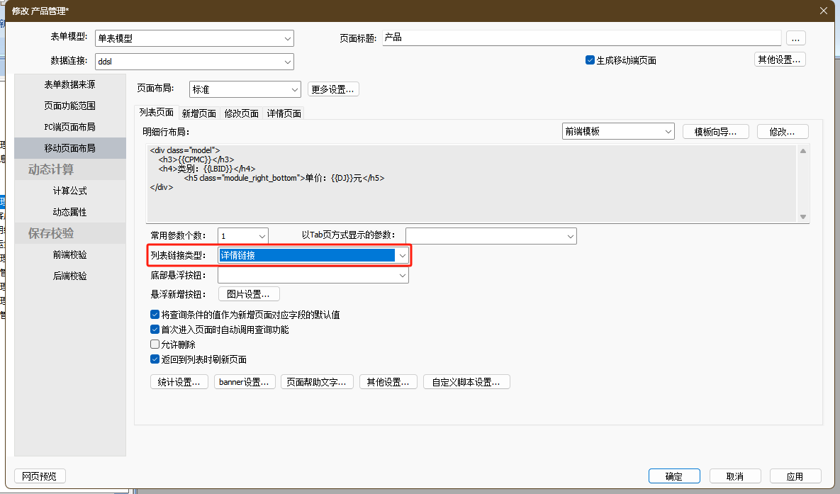 用于配置列表各行数据点击时的跳转链接。默认为详情页面链接,支持配置成自定义链接或第一个链接类型的行内自定义操作,也可以不配置任何链接地址,即点击行数据不支持页面跳转。