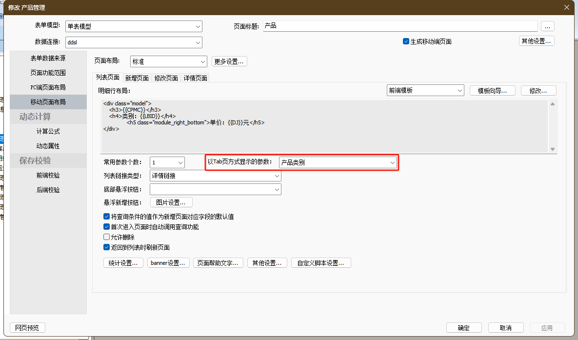 支持将参数中的某个下拉单选框类型的参数设置成Tab页方式显示,例如实例“产品管理”中将“产品类别”设置成Tab页方式展示。