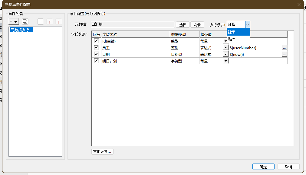 如下图所示,需要选择元数据、选择执行模式、配置回写的字段列表。