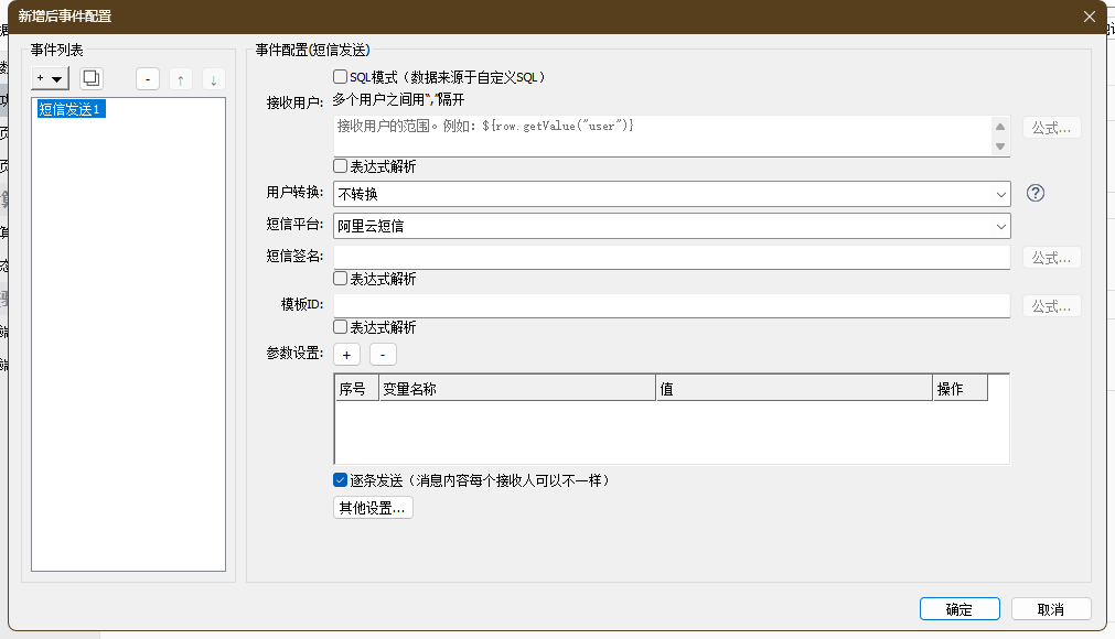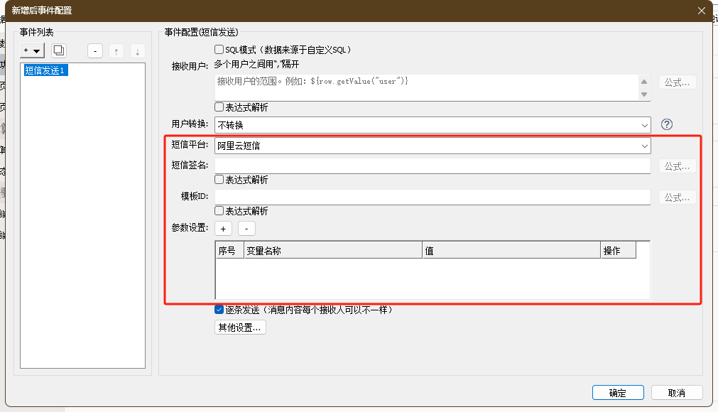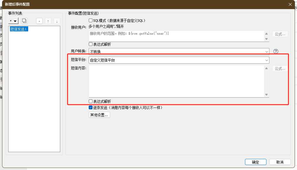 - 短信内容:支持配置常量或表达式。