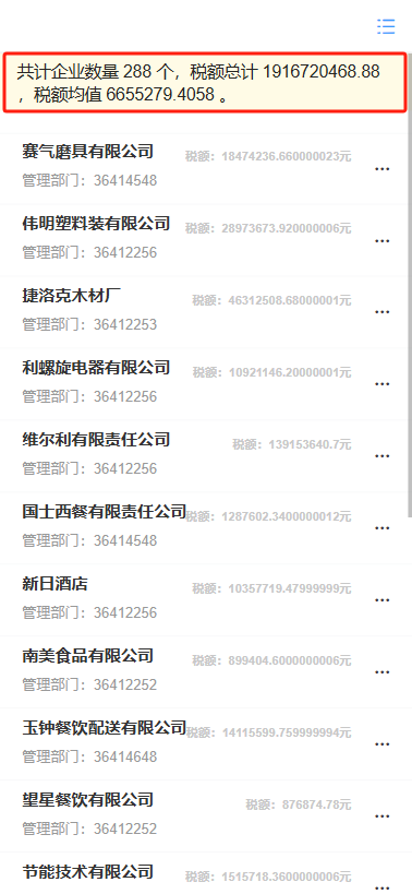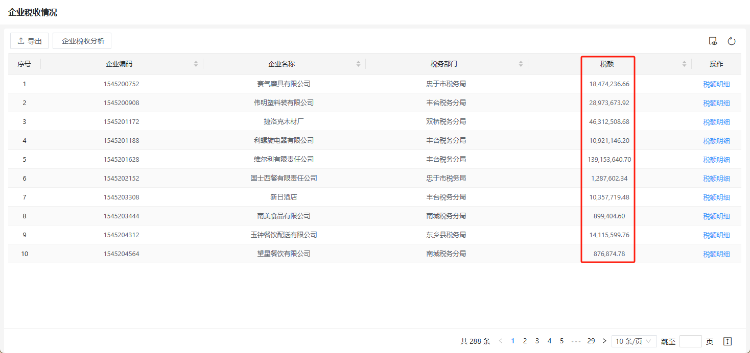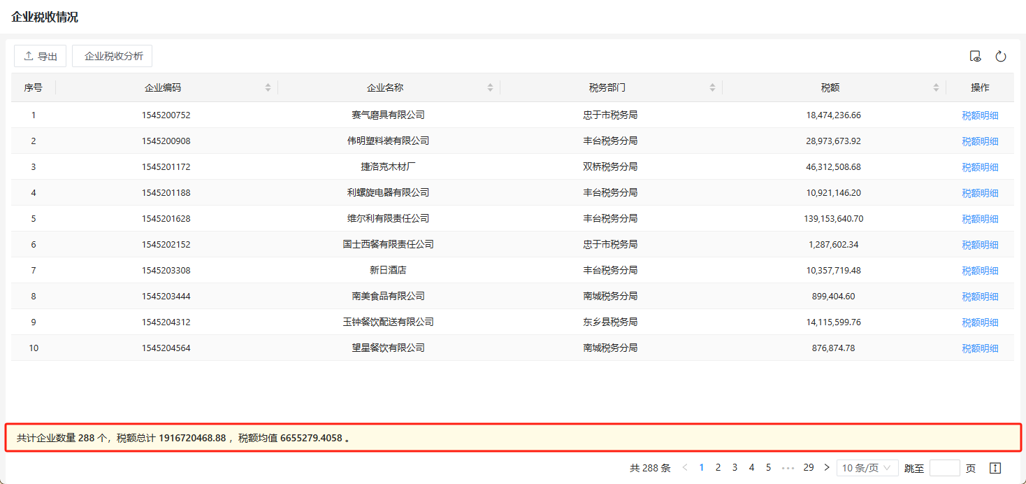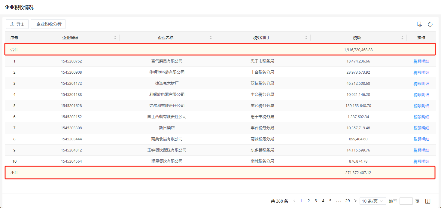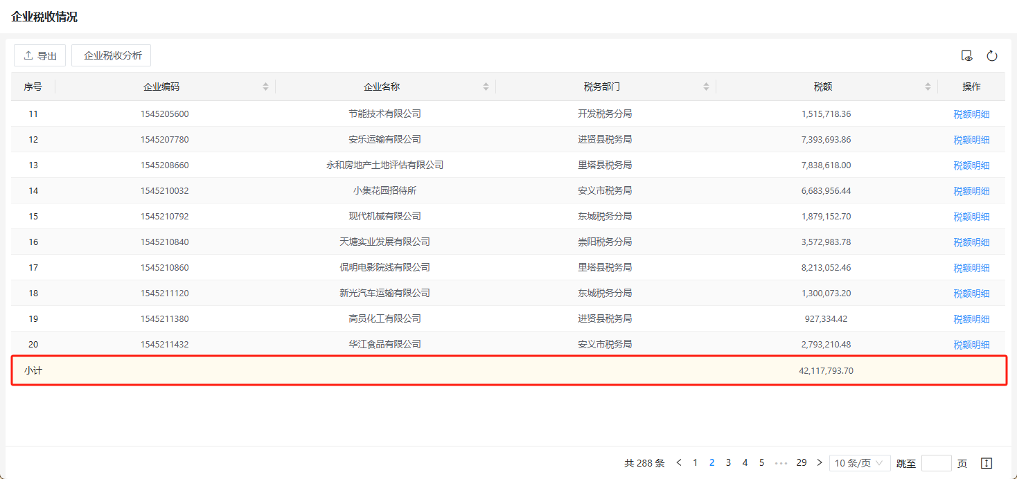 例如希望对实例“企业税收”表单的列表页面的税额数据进行统计,如下图所示。