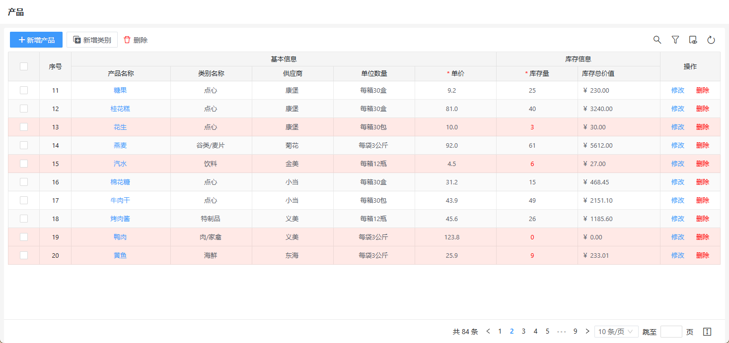 以实例“产品管理”为例,例如我们希望产品列表中库存量不足10件的数据可以以较为明显的样式呈现,就可以利用列表页面表格行样式来设置。