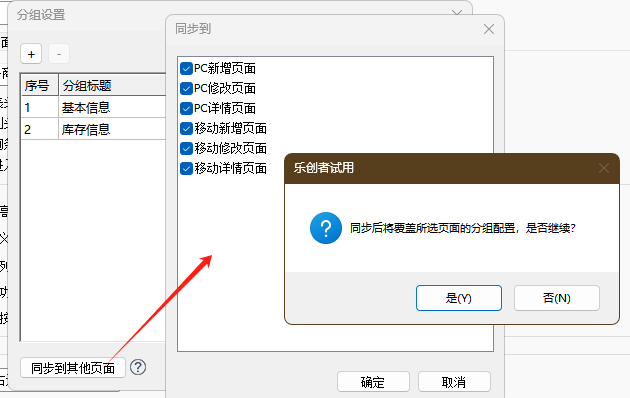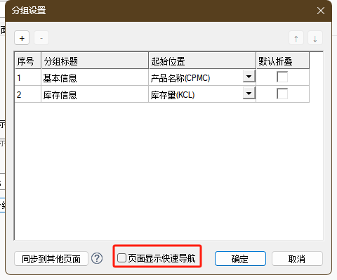 - 同步到其他页面:减少设计人员在各页面的分组都一致的情况下的重复配置,可以配置好一个页面后将分组同步到其他各个页面。