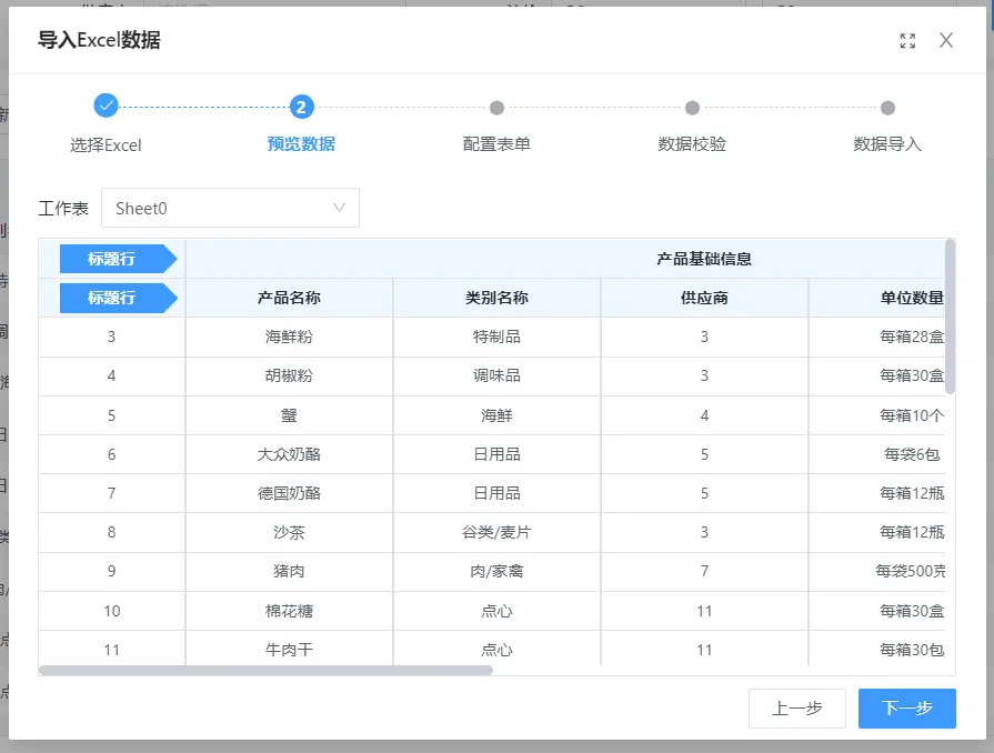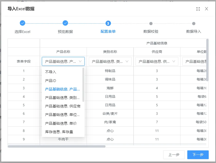 而在导入时,标准模板也支持按复杂列头去匹配,做到更精准的导入。以“高级导入”模式为例,如下图所示,支持读取excel模板文件的复杂列头结构,支持按“分组 · 字段名称”自动匹配,确保复杂列头列表的精准导入。