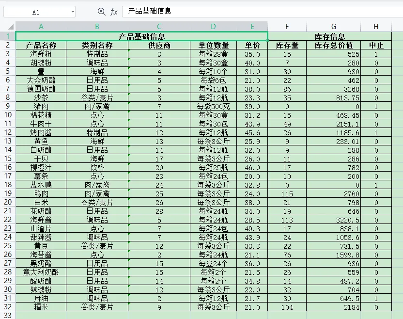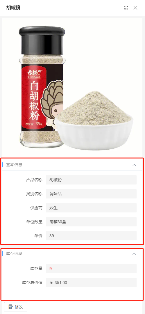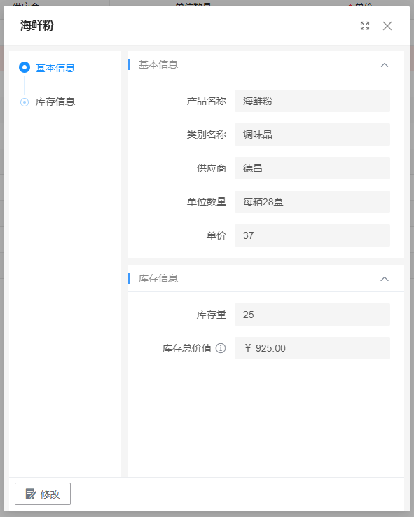 以实例“产品管理”为例,表单填报和显示的依次有“产品名称”、“类别名称”、“供应商”、“单位数量”、“单价”、“库存”、“库存总价值”等字段,可以按业务分为:“产品基础信息”和“库存信息”,在填报和显示时更加清晰。