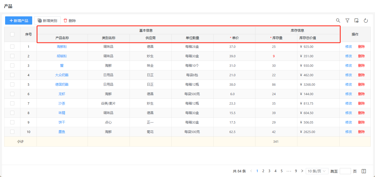 按上述配置后,实例“产品管理”的分组配置显示效果如下图所示,列表页面已经按字段分组显示成复杂列头了。