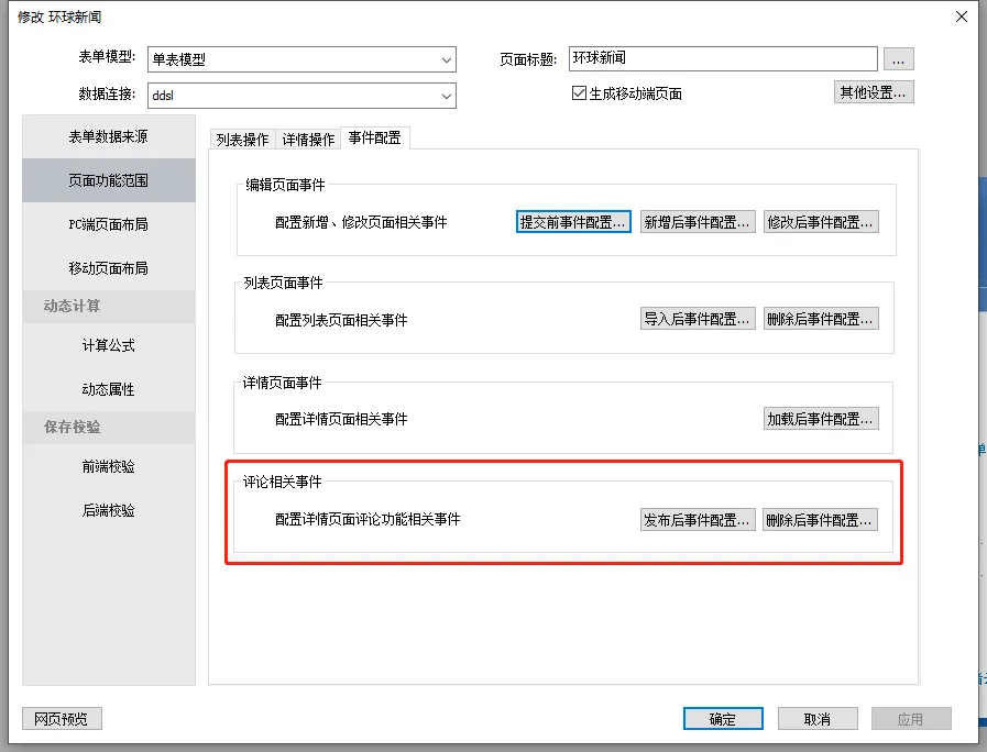 开启评论功能后在“页面功能范围-事件配置”中允许配置评论相关事件,如下图所示。