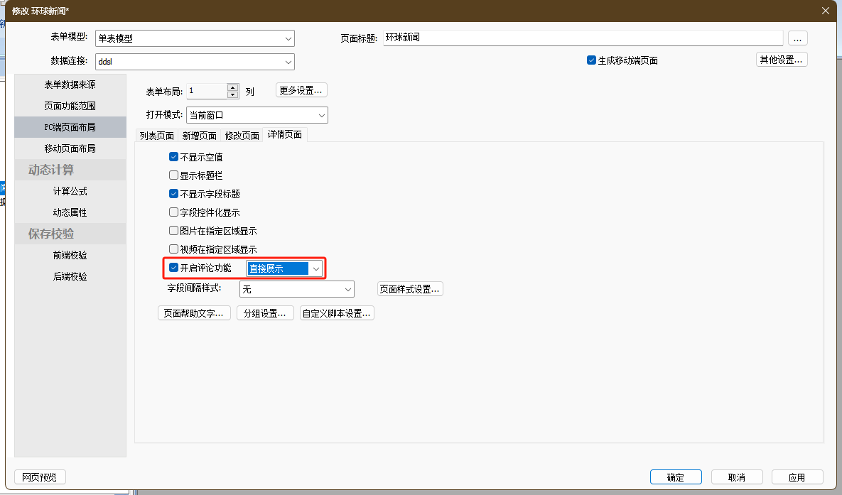 - 勾选【开启评论功能】即可,PC端评论界面支持两种展示方式:“直接展示”和“弹窗展示”,设计者可以根据业务需要自行选择。