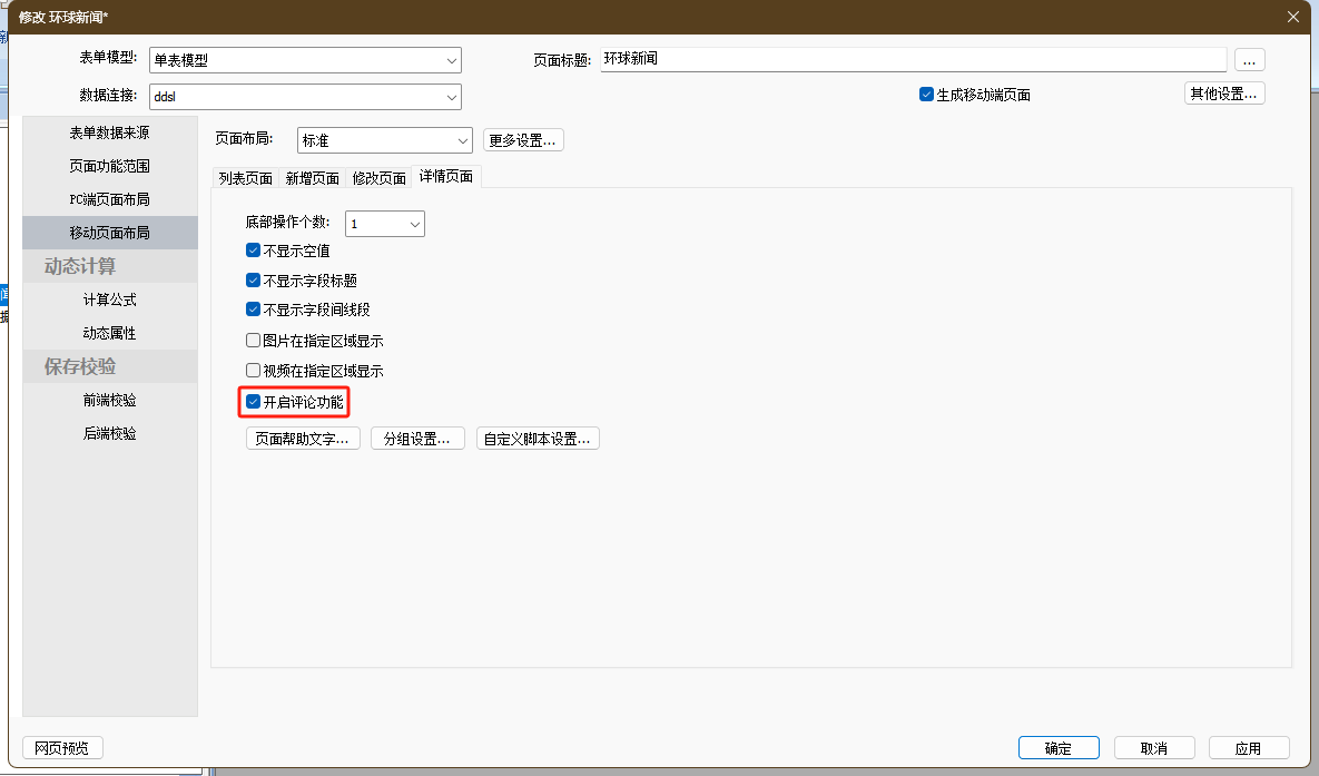 - 勾选【开启评论功能】即可,移动端仅支持在表单下方直接展示评论列表。