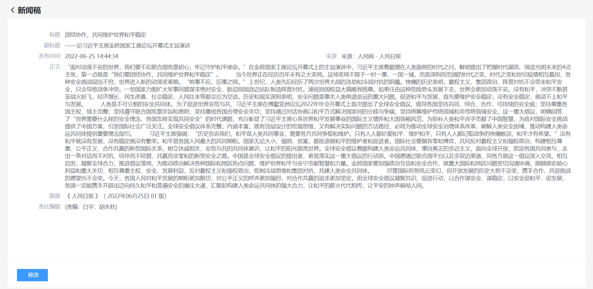 首先,新闻稿肯定是没有我们表单现在看到的这些字段标题,也不应该有顶部的页面标题和底部的修改操作。