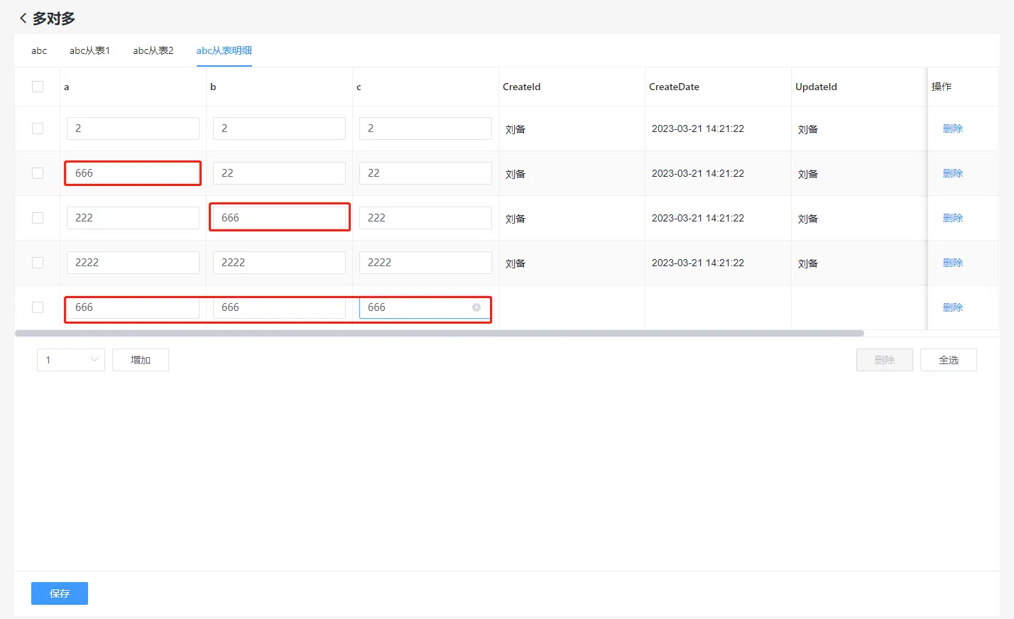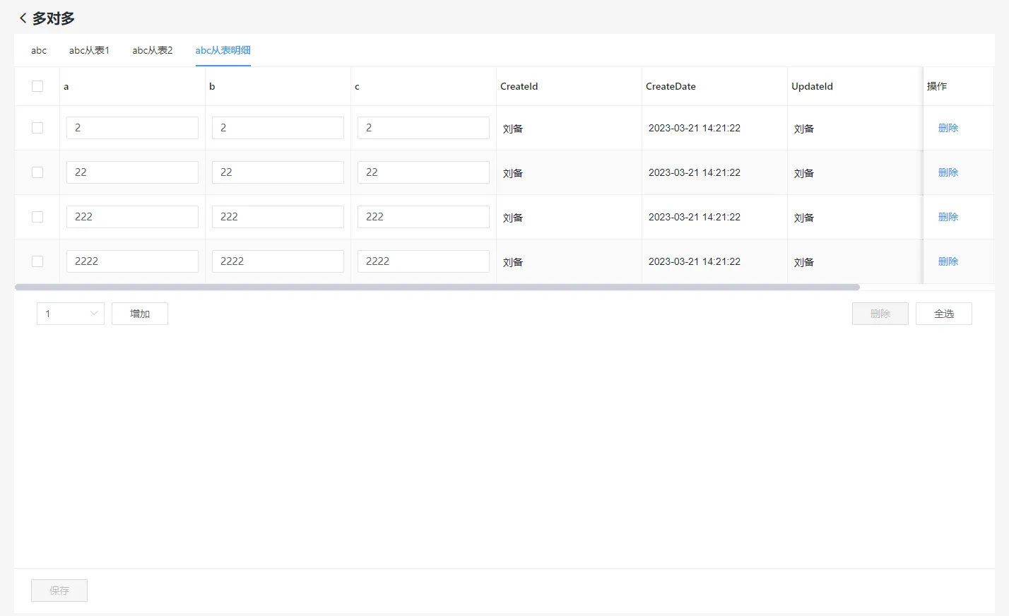 1、如下图所示,使用用户“刘备”创建的记录并在从表明细中创建了四条明细数据,可以看见此时明细的CreateId、CreateDate、UpdateId、UpdateDate,均记录为“刘备”和对应的时间。