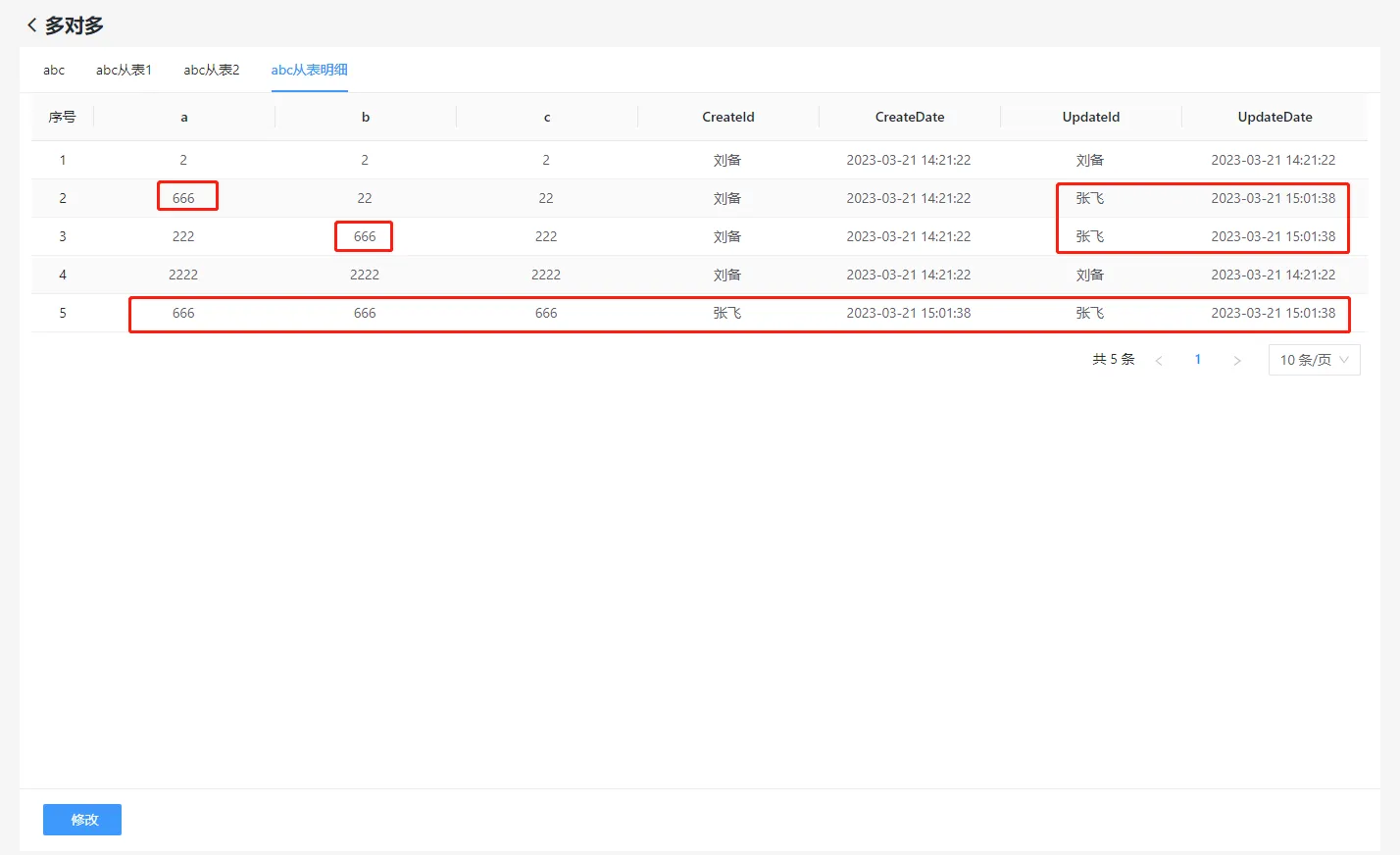 2、此时使用另一个用户“张飞”登录,同样进来维护这个表单的这条记录,并对明细从表进行了部分编辑,例如创建了第5条明细数据,并修改了第2、3条数据的部分字段,如下图。