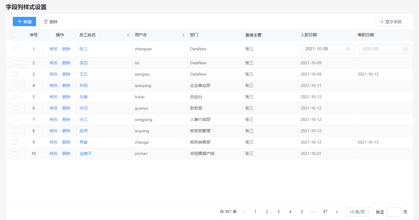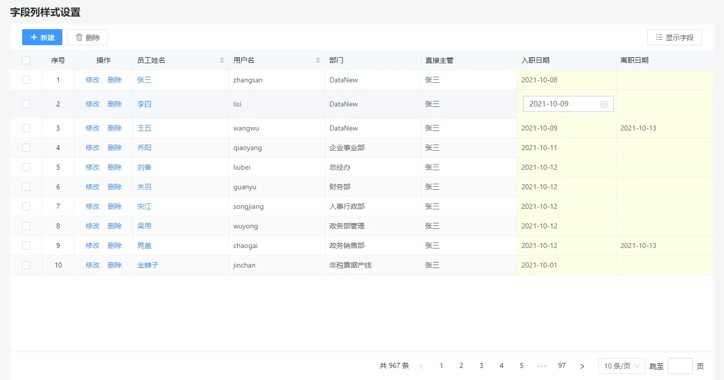 接下来结合实例来说明下上述两个类的用法。如下图所示表格,其中只有“入职日期”和“离职日期”在设计器中被定义为列表可编辑的字段列。