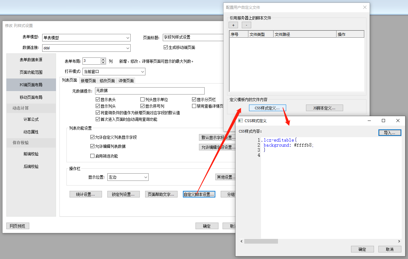 自定义css样式配置依然还是在设计器跨设备表单“模板-PC页面布局-列表页面-自定义脚本设置-CSS样式定义”中进行配置,界面如下图所示: