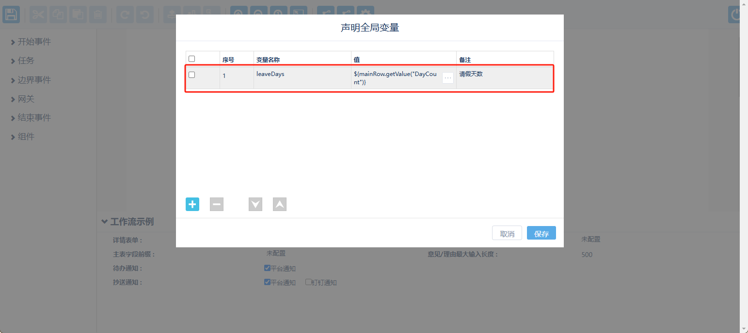 例如请假流程中需要在后续的排他网关根据表单填写的请假天数是否超过7天来决定流程是否需要副总审批,就可以如下图配置,定义请假天数变量leaveDays,并取表单字段请假天数为变量赋默认值,后续流程中就可以只用变量leaveDays来设置流转条件。