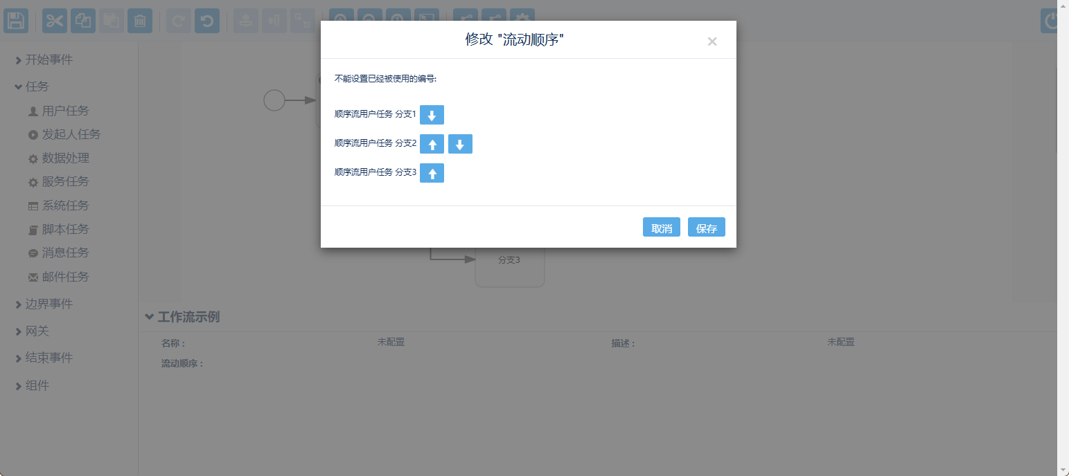 在弹窗中根据业务需要对当前排他网关后的分支进行顺序调整。