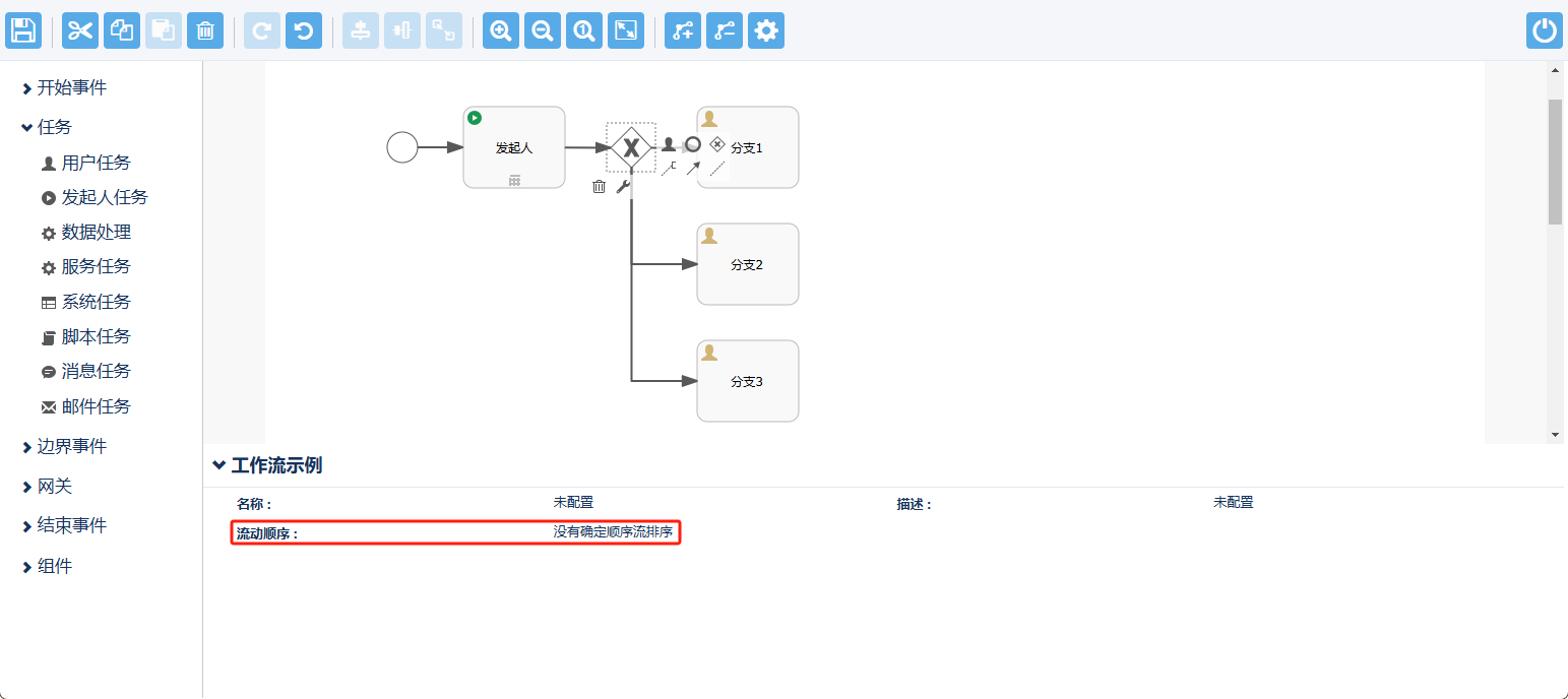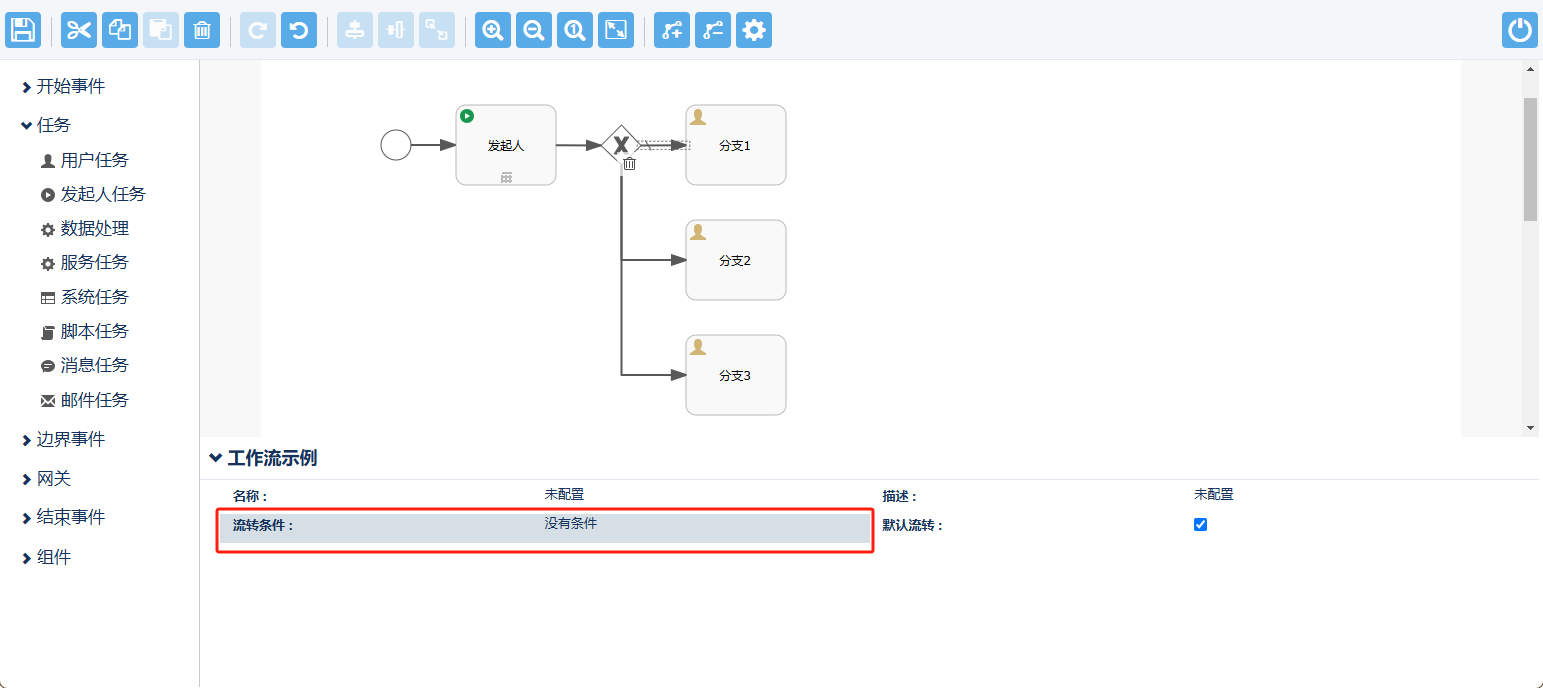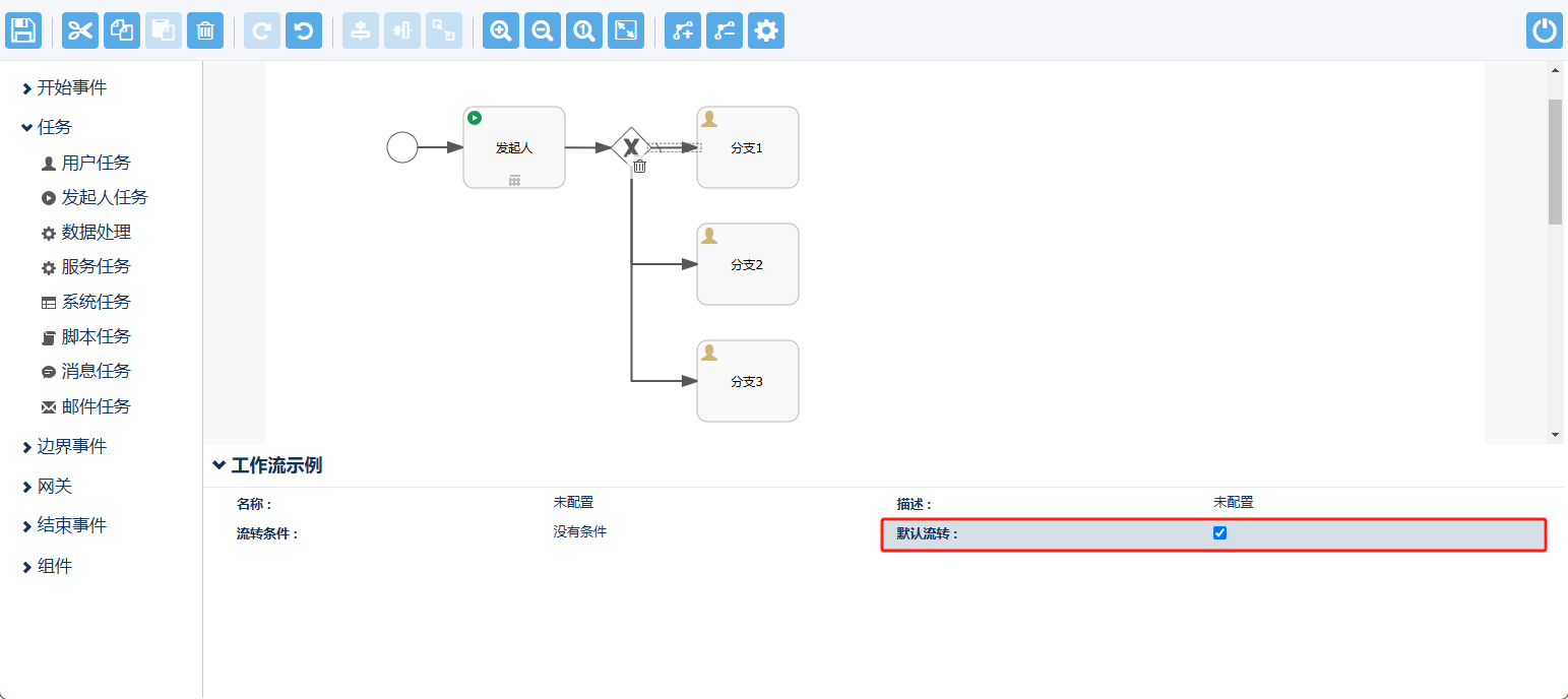 在顺序流上允许设置默认流转顺序流,若所有顺序流上的条件均为false时且定义了默认流转顺序流时,此时流程会按照默认流转顺序流运行。