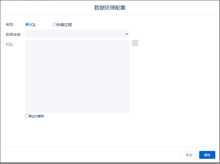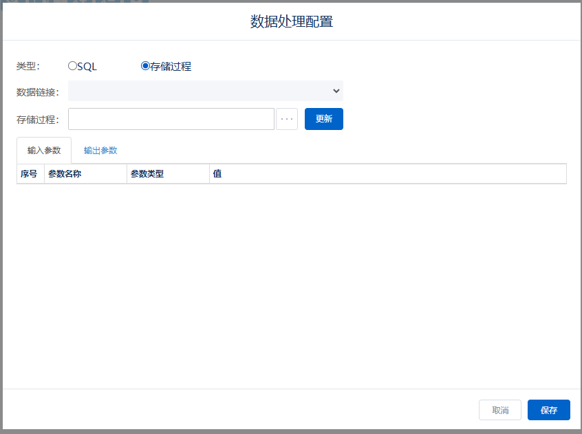 - 数据处理:配置具体的数据处理执行方式和内容,支持两种执行方式:执行SQL或存储过程;