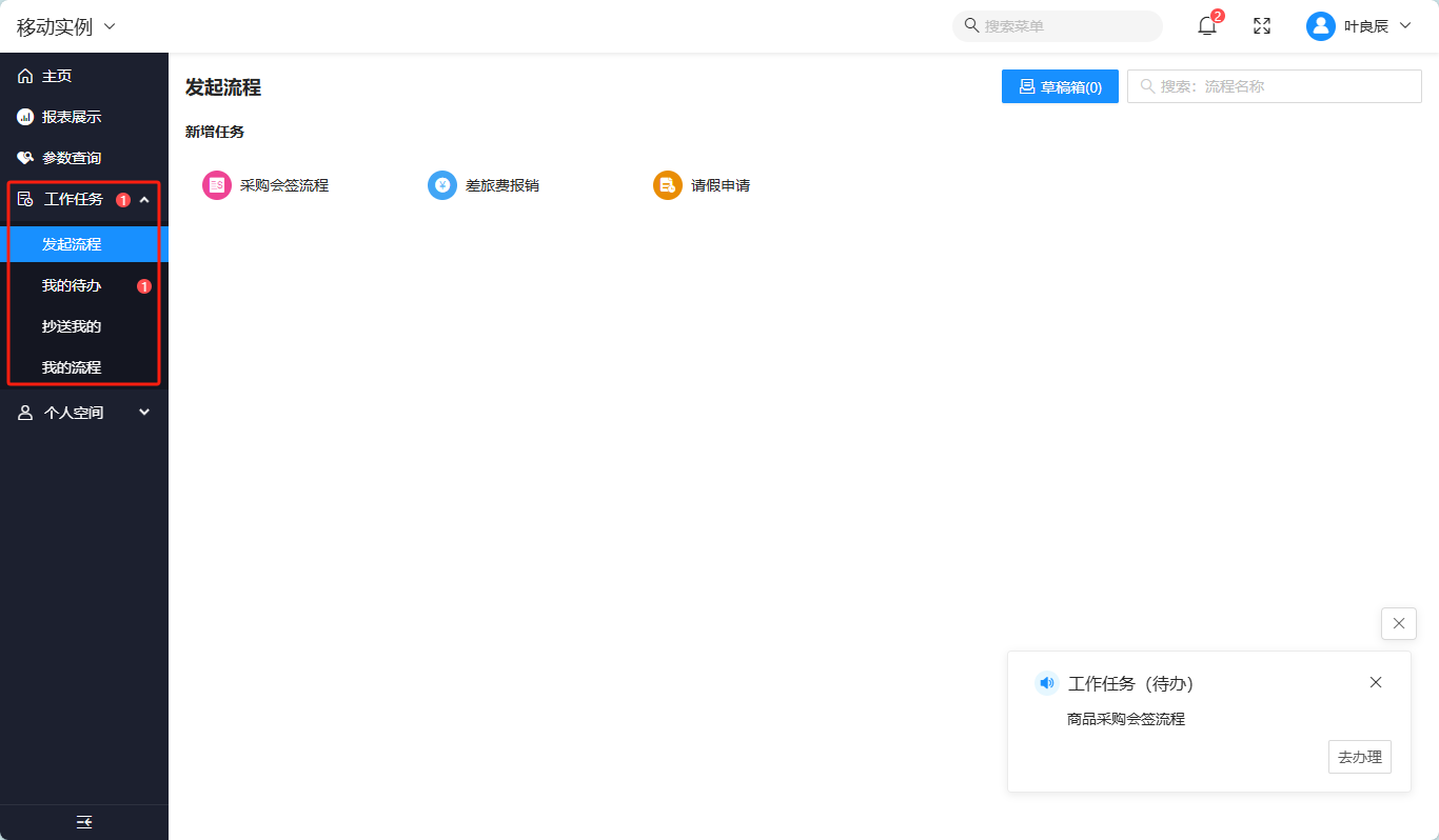 - 发起流程:显示配置工作任务菜单,一般配置为流程发起表单,点击后可以在全屏弹窗中打开具体某个流程发起界面进行数据填报和发起,同时也只会。配置方式请查阅章节 系统功能:任务面板 和 应用管理:任务面板。