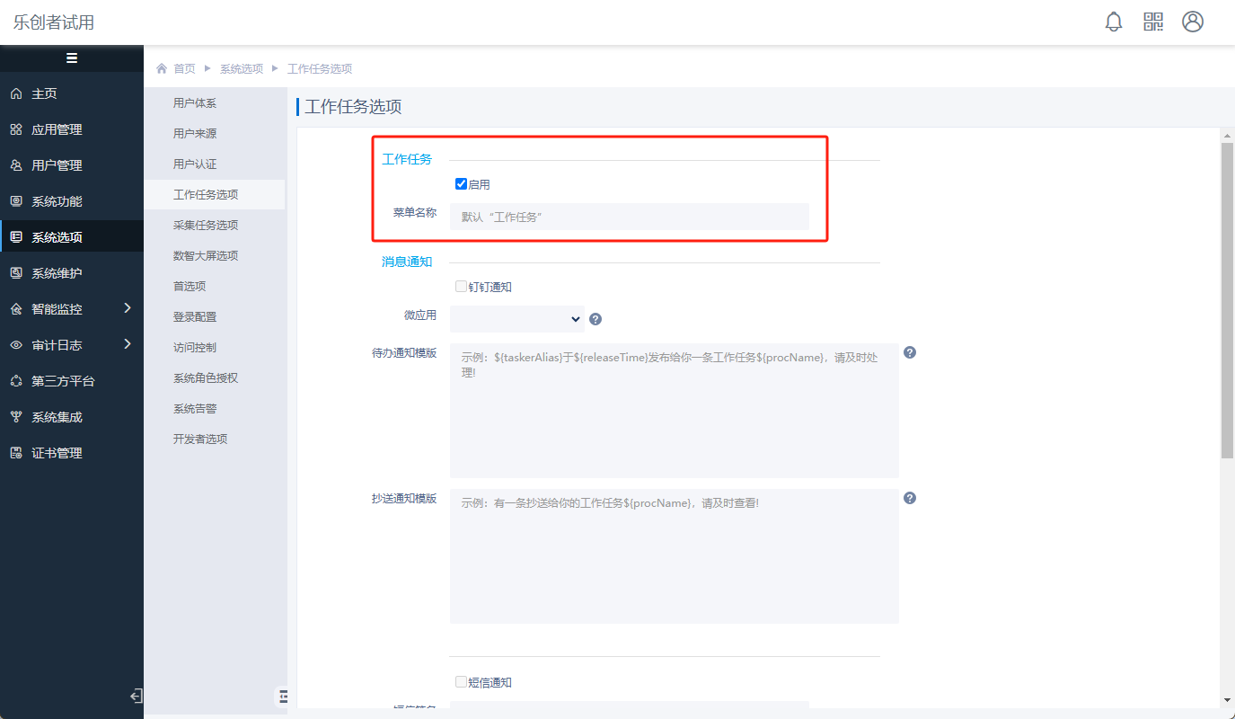 需要在系统管理员登录系统在[系统选项>工作任务选项]中开启相应功能方可使用,详细配置说明请查阅章节 工作任务选项。