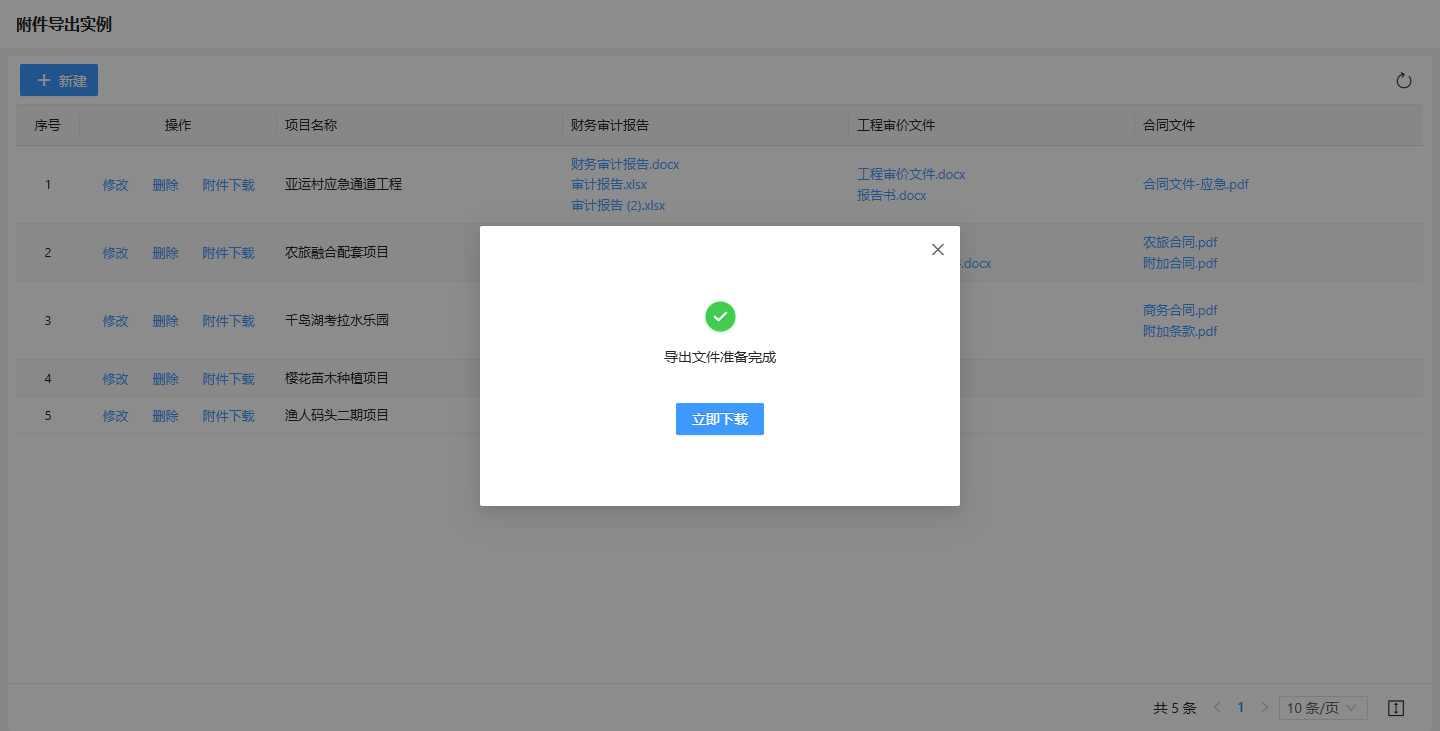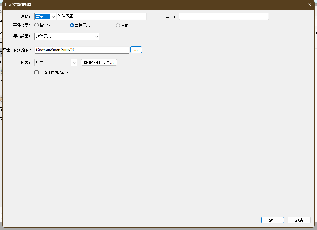 如果希望制作一个行内操作来批量导出附件,导出压缩包的名称以表单中的“项目名称”字段值来命名,可以配置如下。
