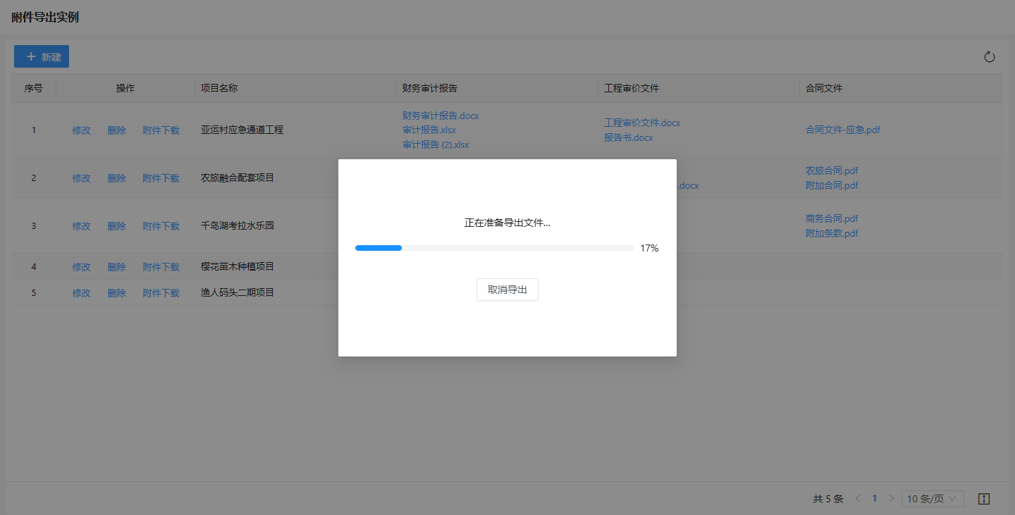 仅PC端支持附件导出功能,点击需要导出记录的行内自定义操作【附件下载】后,导出过程如下图所示,生成导出文件会显示准备进度条。