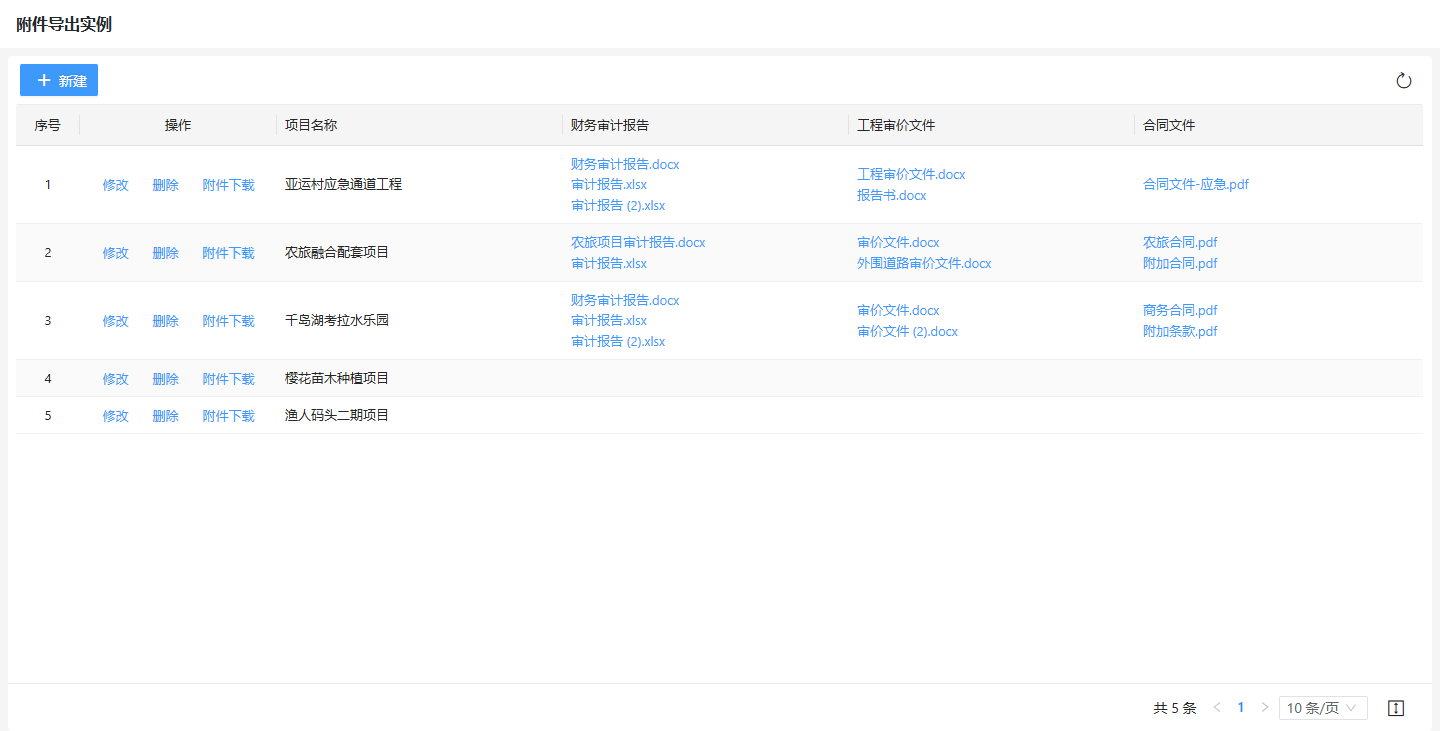 审核人员在审核时需要逐一查看附件,默认需要一个个附件点击下载,操作繁琐。如果使用了批量导入附件功能,可以实现一键下载当前行的所有附件数据。