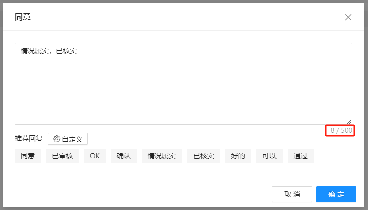 为避免数据回写报错,我们可以在工作流【意见/理由最大输入长度】中设置不超出数据表中最大输入字符数的数值(默认为500字),从前端意见填写输入框进行控制防止输入的意见内容超出字段可接收最大值。详细配置请查阅章节:工作流审批意见/理由字符长度设置