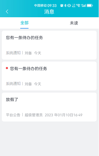 “全部”tab中显示的是该用户接收的全部消息,“未读”tab中显示的是接收的未读状态的消息- 消息按照发布时间降序显示;