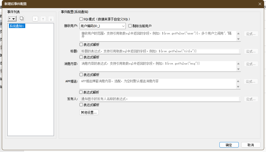 - SQL模式(数据来源于自定义SQL):开启后适用于更加灵活的数据来源,可以通过SQL取数使得【接收用户】、【标题】、【消息内容】、【发布人】等数据来源于取数SQL的返回字段值,格式同字段取数后台表达式${row.getValue(‘字段名称’)}。