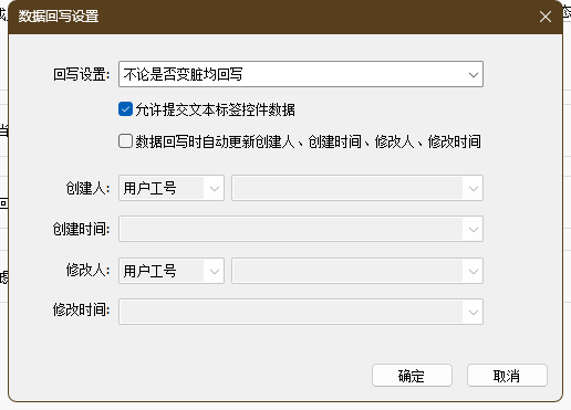 默认勾选,用于配置填报页面是否需要回写文本标签控件数据,有时文本标签控件是不允许修改的,理论上可以不必回写。数据回写时自动更新创建人、创建时间、修改人、修改时间